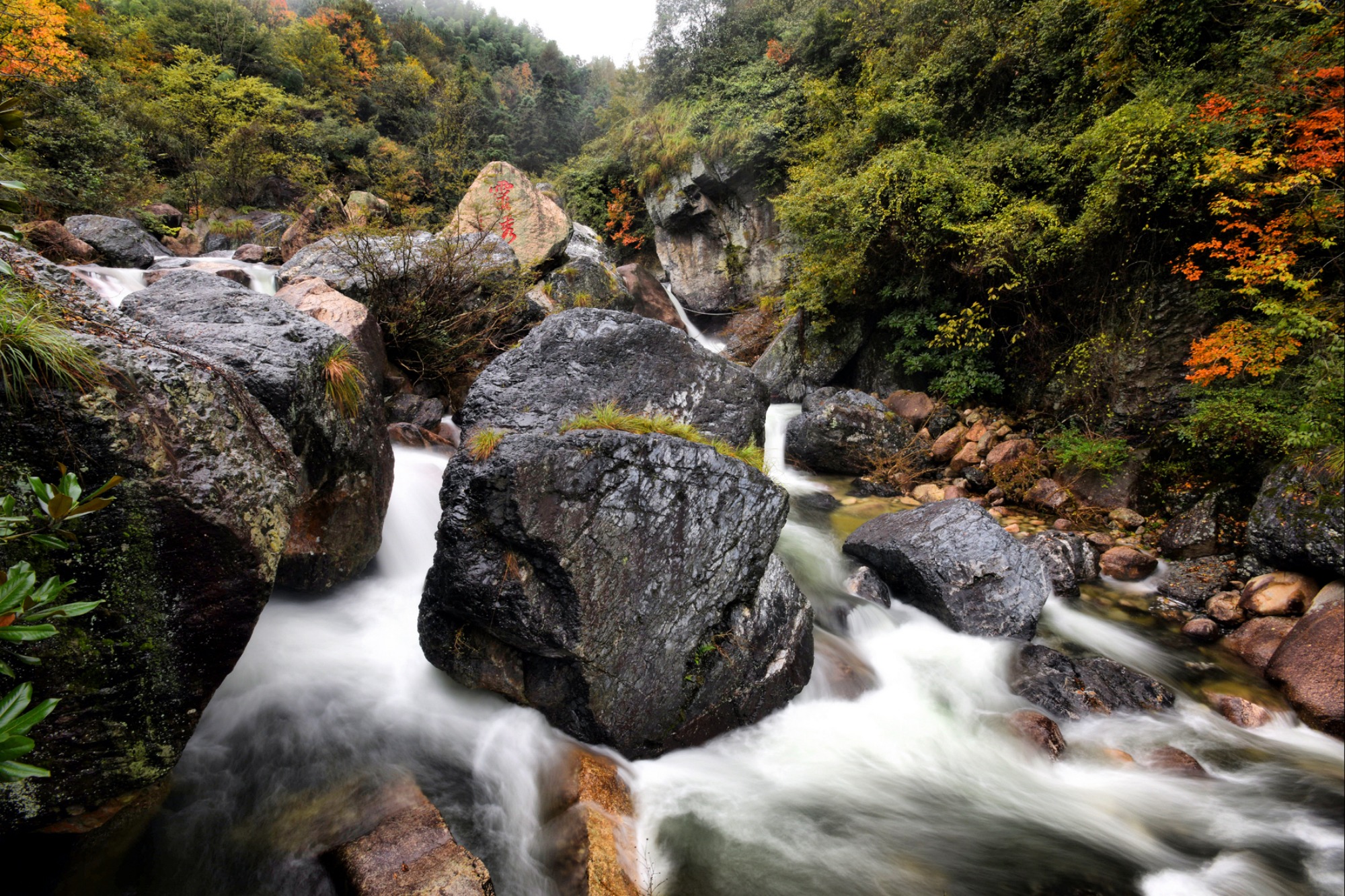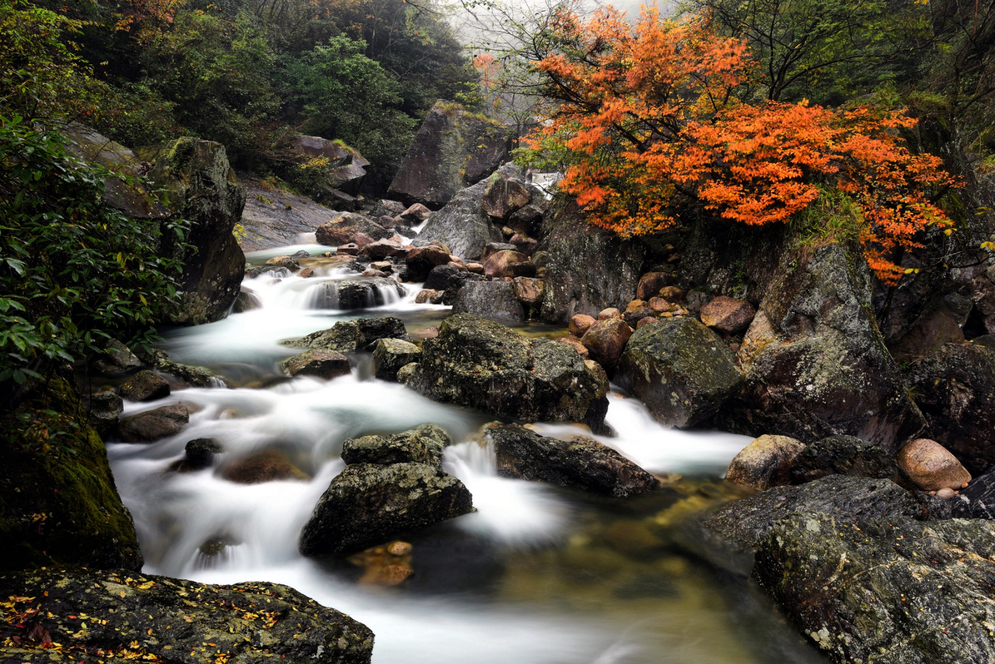 溪水潺潺而下,从嶙峋怪石间跌落,水花飞溅如碎玉。慢门拍摄下,溪流仿佛变成了丝滑的绸缎,尽显柔美。