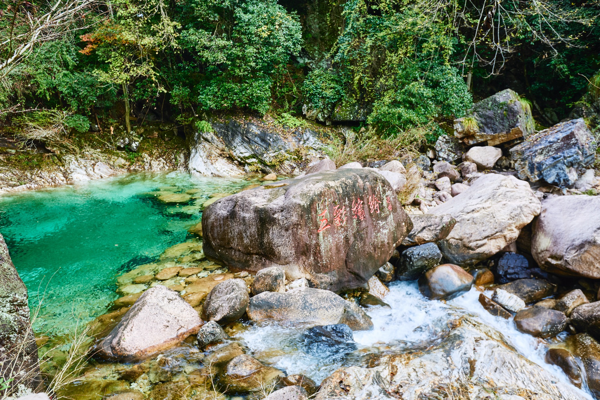 走一段路便邂逅一个美丽彩池,宛如在捡拾一颗颗晶莹剔透的翡翠。秋天的阳光和煦温暖,照耀着池水,池水颜色明暗变幻,清澈得能轻松看到池底礁石。