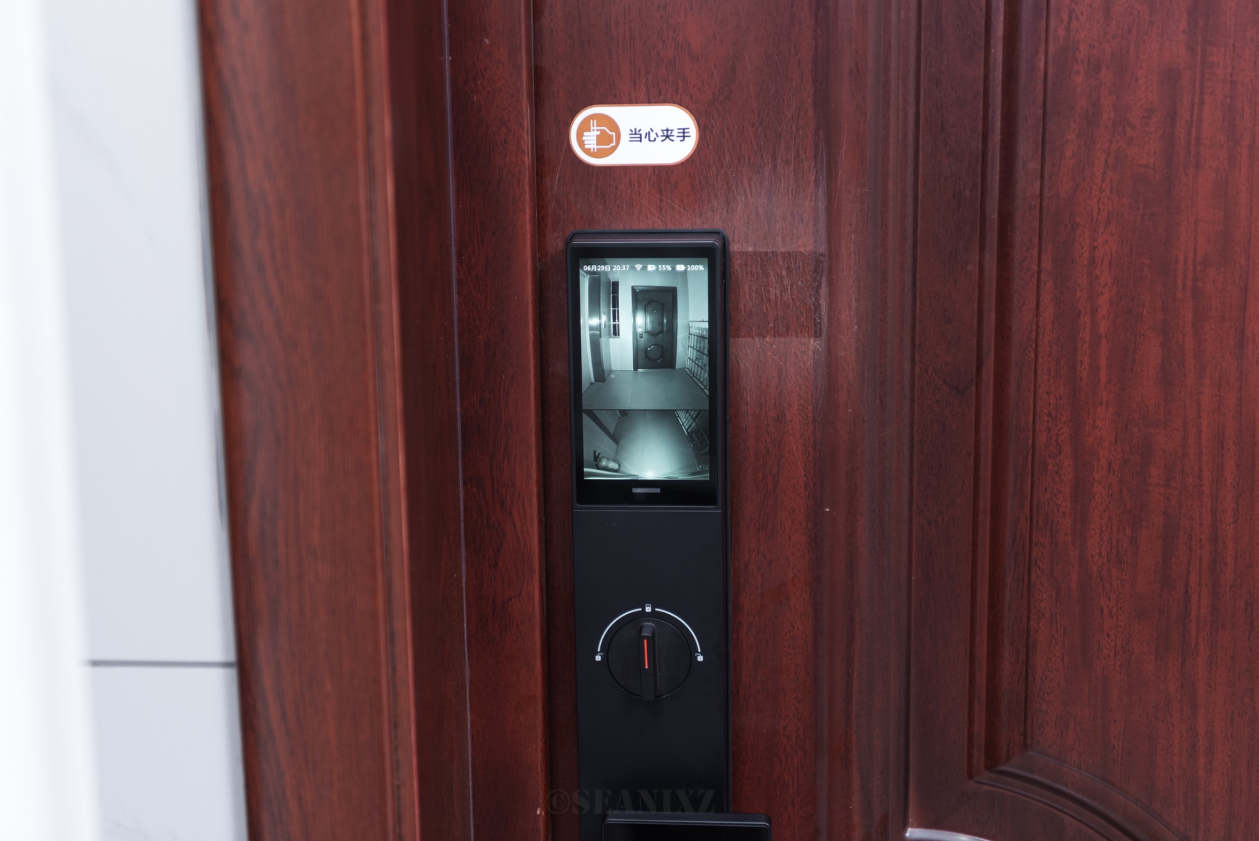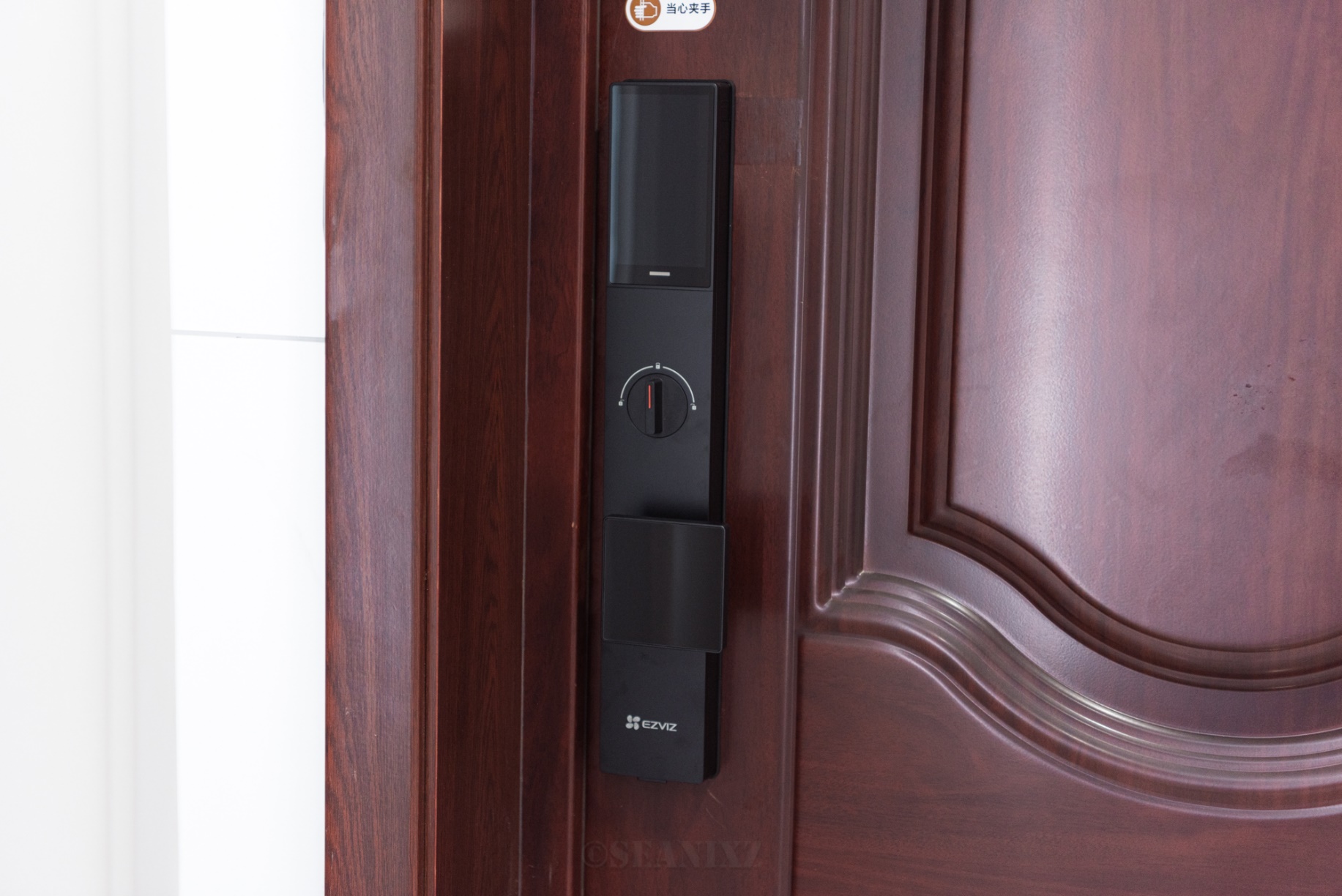 设计还有不少小细节,与传统门锁把手位于正中央不同,萤石创新性地采用了偏位设计,不仅外观更加独特,更重要的是有效解决了使用过程中可能出现的夹手问题,对家里两个孩子非常友好。