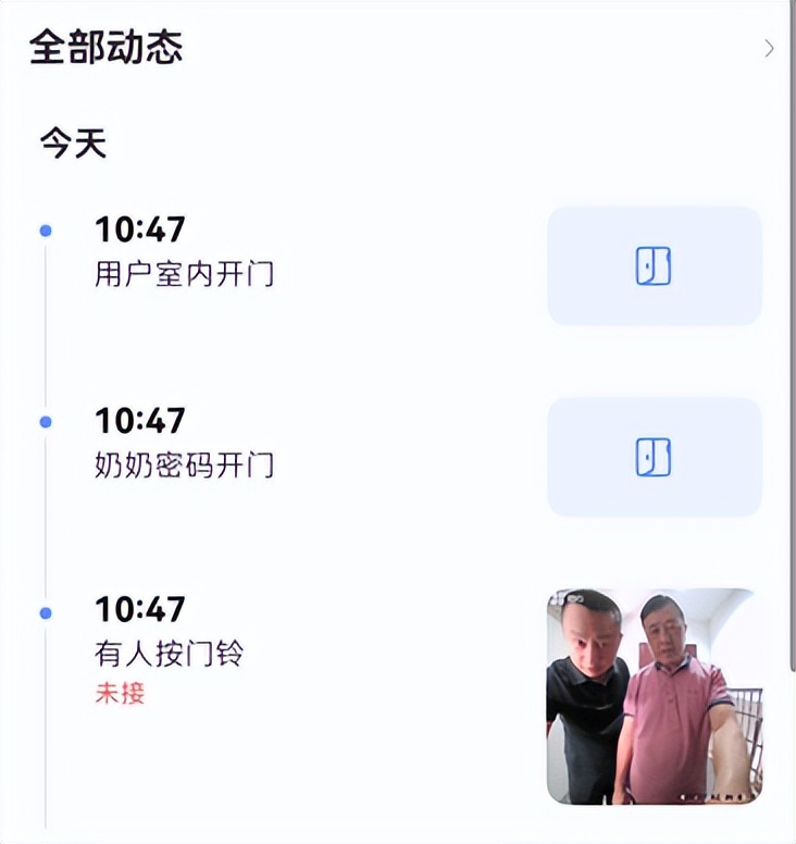 室内4.7寸大屏幕的设计也非常实用,当外面按门铃时,会自动亮起开启,无需开门就能通过内屏确认对方身份,还带有变声对讲功能,即使老妈一个人在家的时候也可以用"大叔音"对讲,有一定的震慑作用,长期居住也更安全。