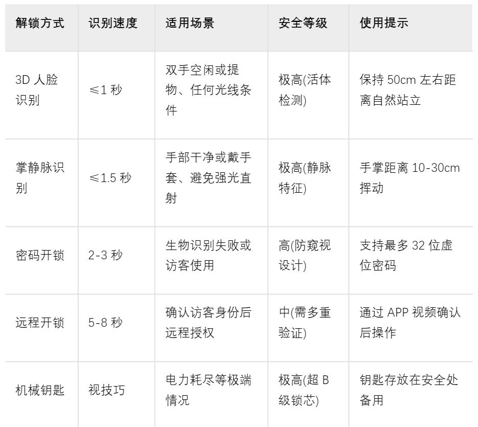支持5种解锁方式,3D人脸识别和掌静脉识别是体验最好的,可以实现一秒解锁的行云流水般无缝开门,堪称极致,这也是日常用的最多的方式。