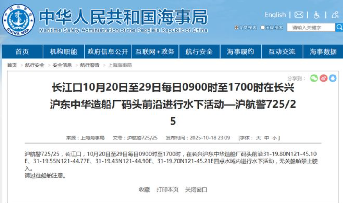 另据上海海事局10月18日发布的沪航警725/25公告,在船坞入口正前方划定一块小型矩形禁入区,四点连线内进行水下活动,从10月20—29日禁止无关船舶驶入。从上海海事局发布的航行警告来看,相关弹小车测试可能要进行10天的时间。