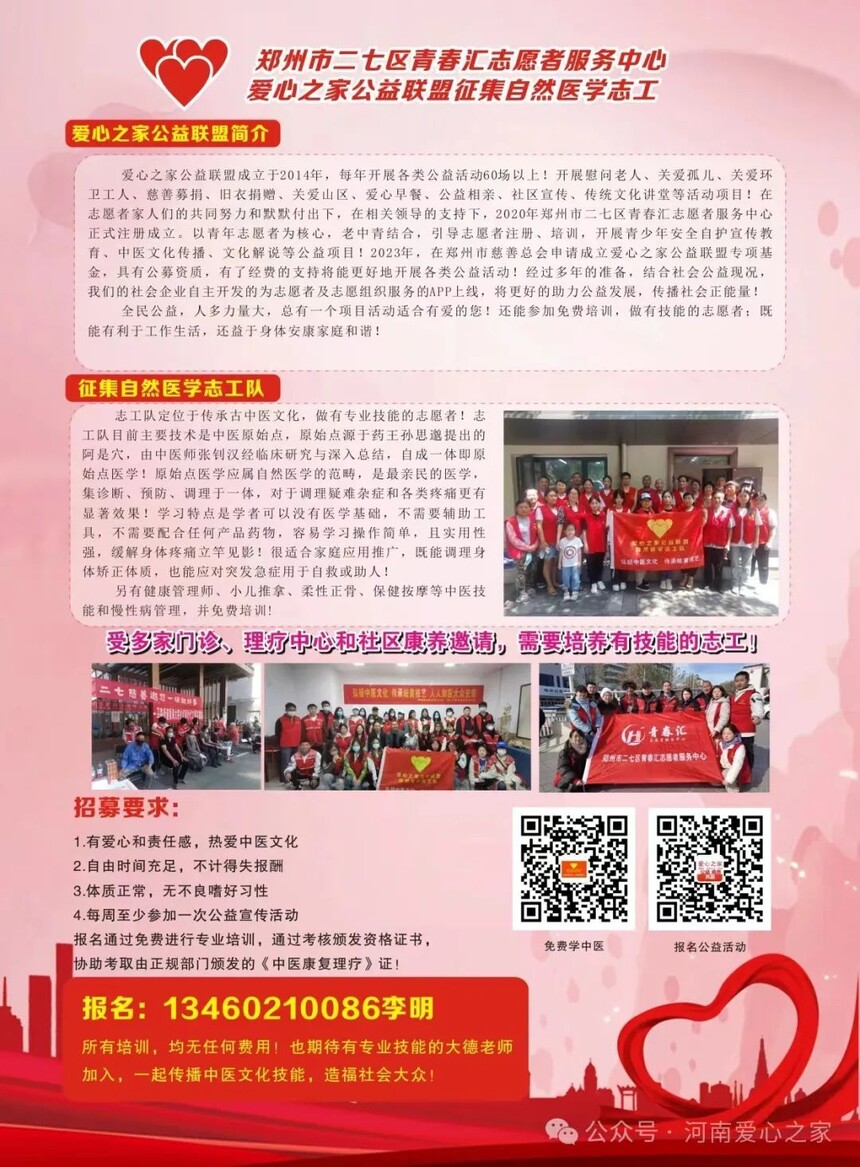 爱心之家公益联盟成立于2014年,每年开展各类公益活动60场以上!开展慰问老人、关爱孤儿、关爱环卫工人、慈善募捐、旧衣捐赠、关爱山区、爱心早餐、公益相亲、社区宣传、传统文化讲堂等活动项目!在志愿者家人们的共同努力和默默付出下,在相关领导的支持下,2020年郑州市二七区青春汇志愿者服务中心正式注册成立。以青年志愿者为核心,老中青结合,引导志愿者注册、培训,开展青少年安全自护宣传教育、中医文化传播、文化解说等公益项目!2023年底,在郑州市慈善总会申请成立爱心之家公益联盟专项基金,有了经费的支持将能更好地开展各类公益活动!经过多年的准备,结合社会公益现况,我们自主开发的为志愿者及志愿组织服务的APP在三月份即将上线,将更好的助力公益发展,传播社会正能量!