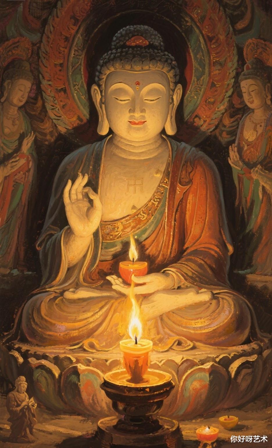 在油画的绚烂世界里,一幅《燃灯古佛》宛如一颗来自遥远佛国的璀璨星辰,散发着神秘而深邃的光芒,吸引着观者踏入一场视觉与心灵的双重朝圣之旅。