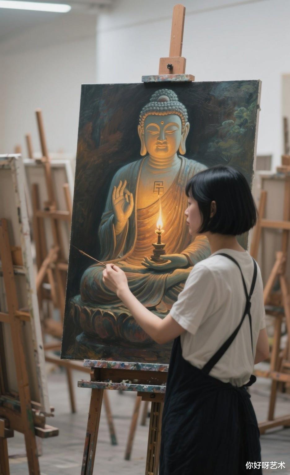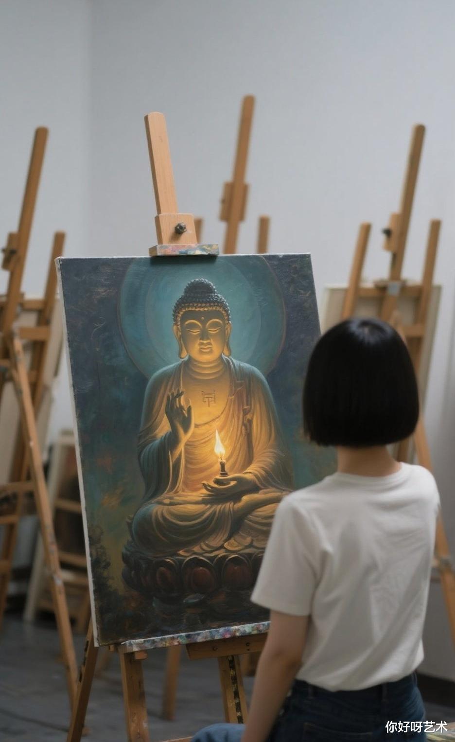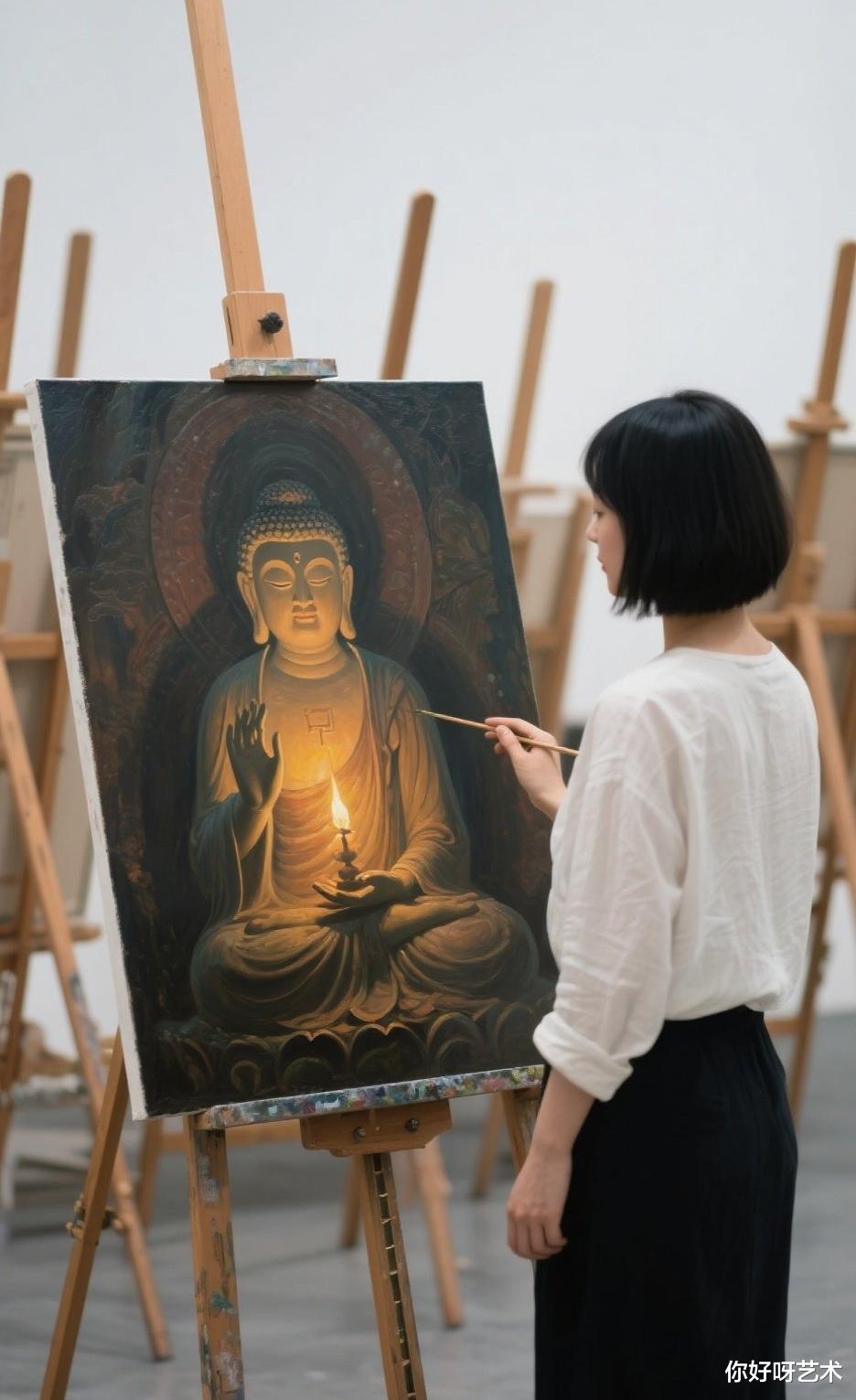 它以油画这种现代艺术形式展现古老的佛教文化,让古老的信仰在现代的艺术语境中焕发出新的生命力。无论是对于佛教信众,还是对于艺术爱好者,这幅画都是一座连接心灵与艺术、宗教与现代文化的桥梁,引领我们在色彩与线条的世界里,感悟佛韵与禅意的无尽魅力。
