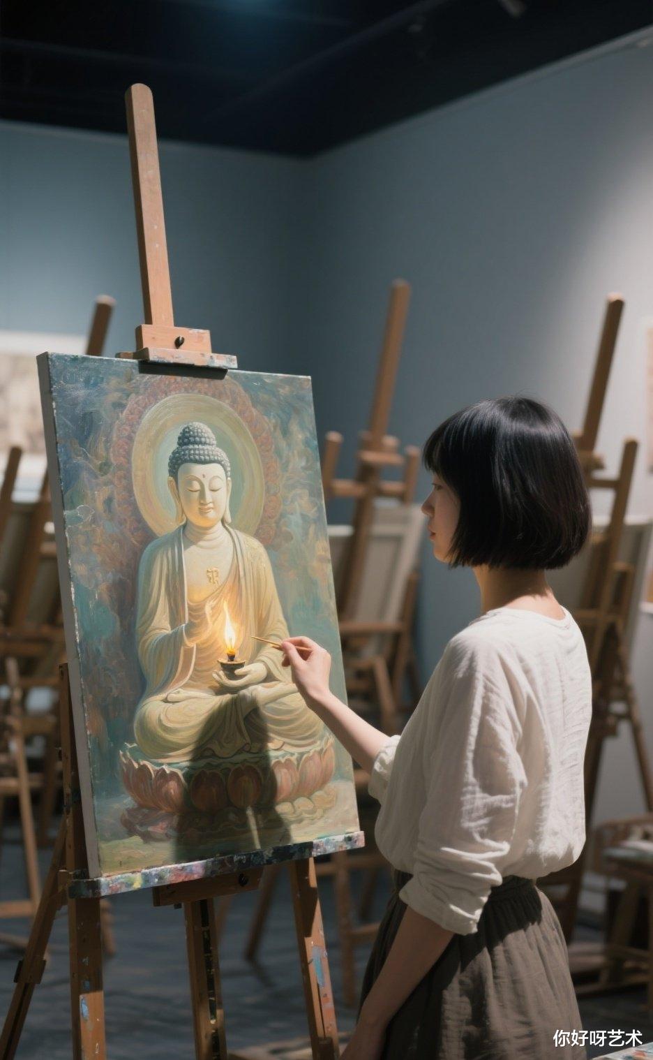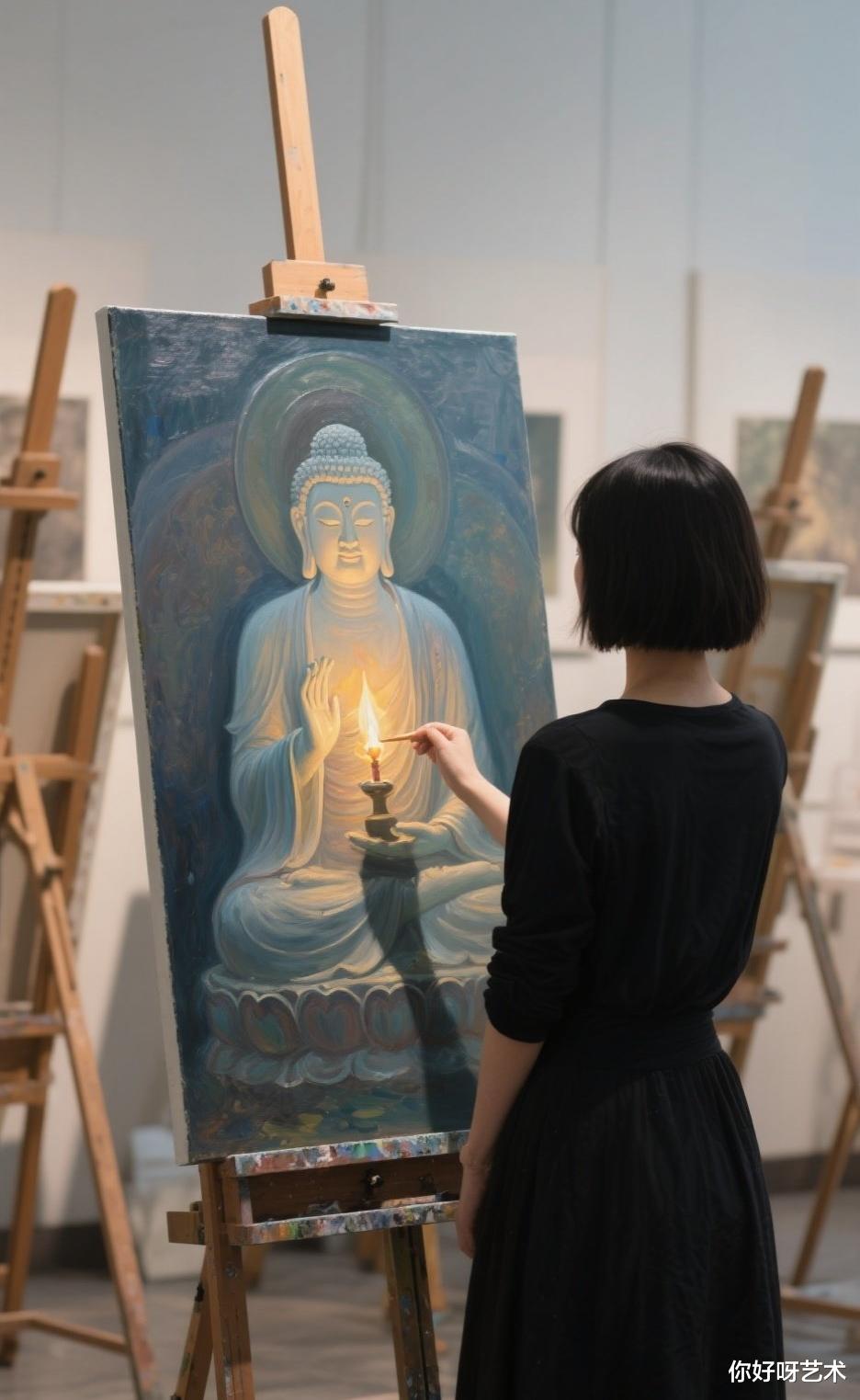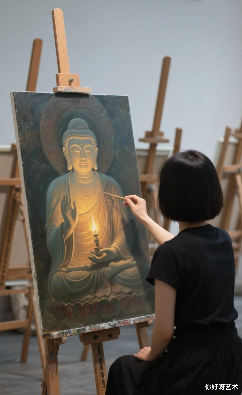 它以油画这种现代艺术形式展现古老的佛教文化,让古老的信仰在现代的艺术语境中焕发出新的生命力。无论是对于佛教信众,还是对于艺术爱好者,这幅画都是一座连接心灵与艺术、宗教与现代文化的桥梁,引领我们在色彩与线条的世界里,感悟佛韵与禅意的无尽魅力。