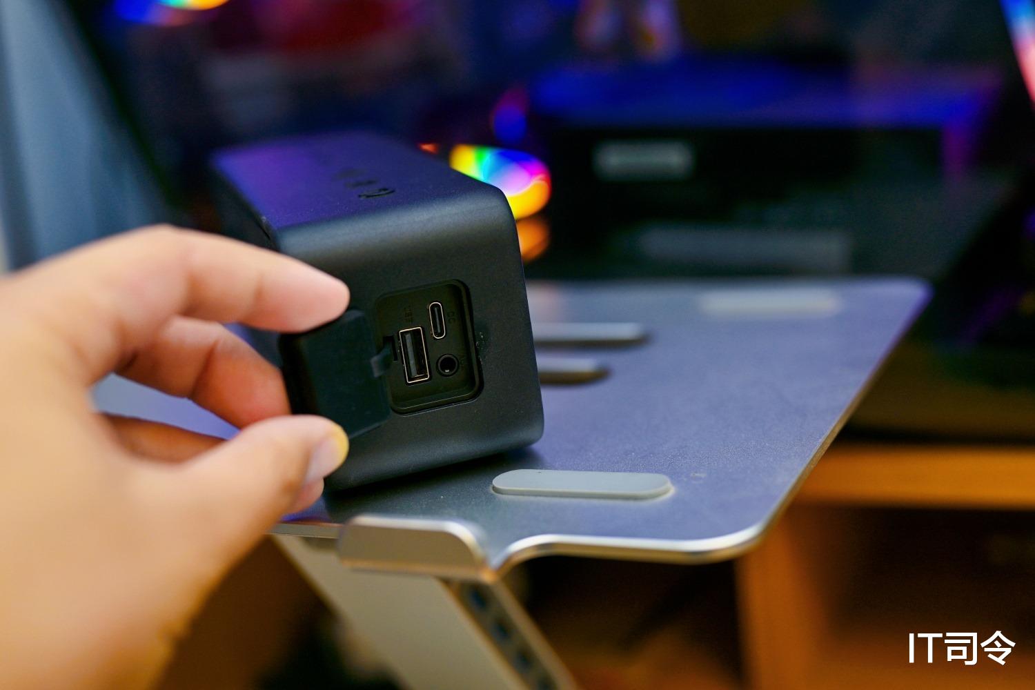 左侧是橡胶密封的功能插口,一个USB插口,一个Type-C插口,一个AUX插口。通过短按开关键可以实现蓝牙模式、AUX模式和USB模式的切换。而且OHAYO雷登S11采用新型蓝牙5.3高性能芯片,延迟低至45ms,秒配不卡顿,非常nice。