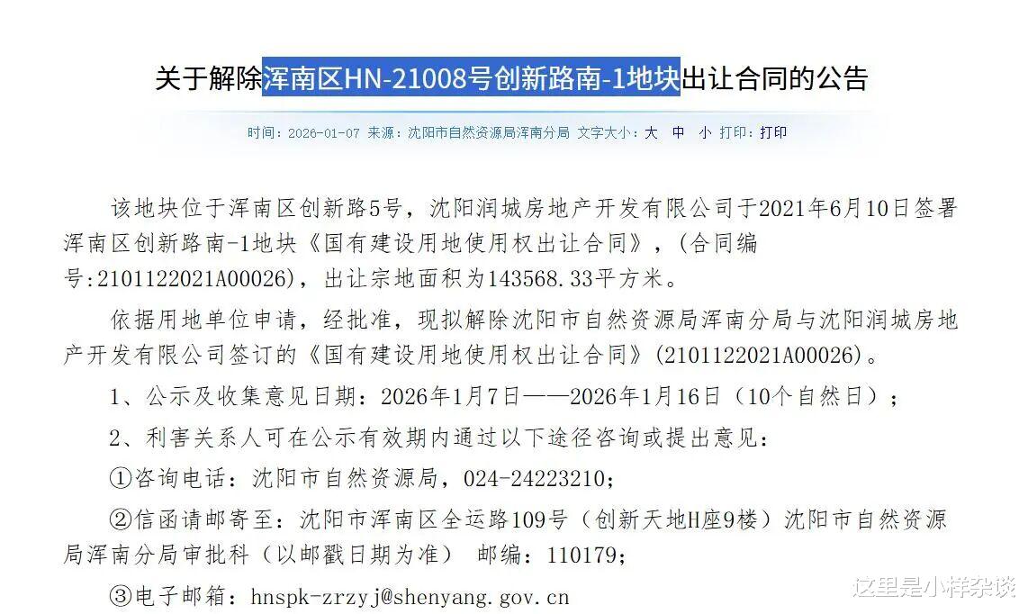 (图片来源于网络)但是过去了快两年了,这个项目并没有重新,现在这个项目出现了最新变化,2026年1月7日沈阳市自然资源局发布公告,这块地解除出让合同了。