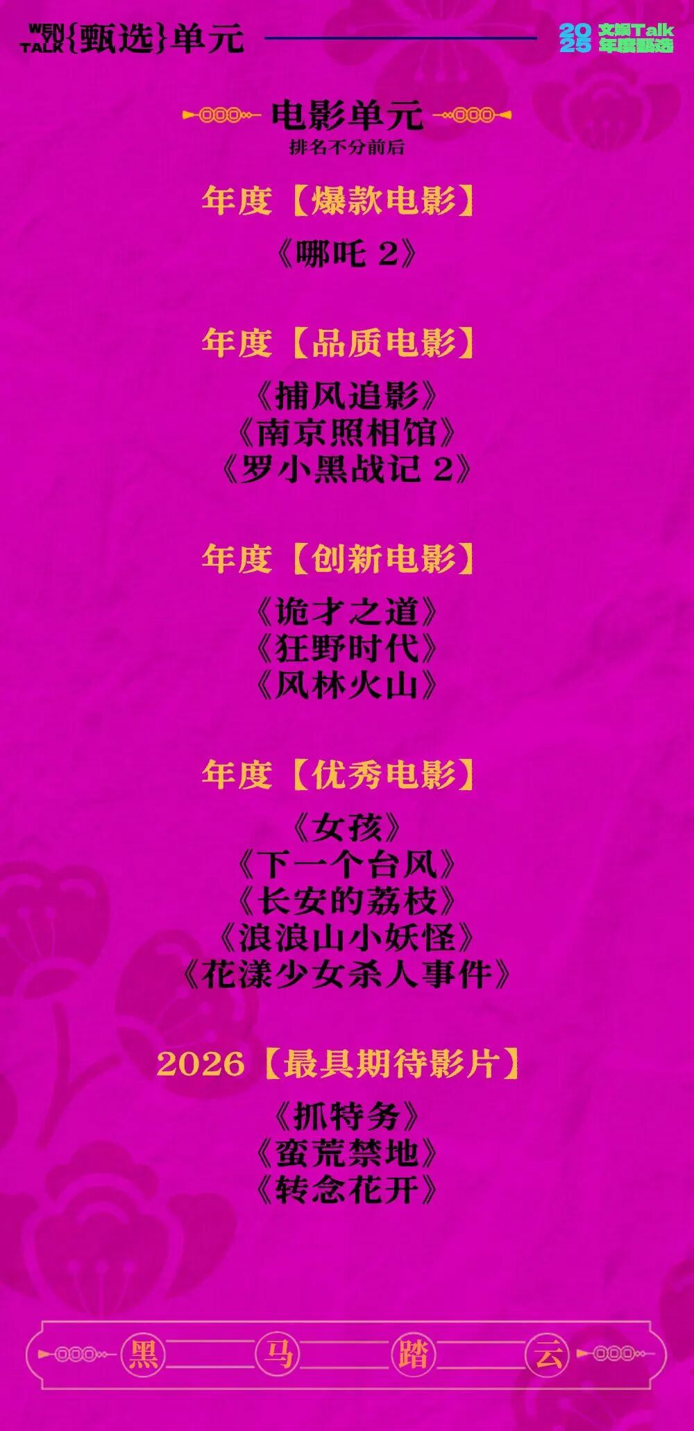 这份获奖名单,细数了2025年华语银幕的高光时刻,也暗含电影市场的主要趋势的观察:国民IP +情绪共鸣是票房密码,主旋律破题与港片传承拓宽品质赛道,实验性与时代性兼具的作品扛起创新大旗,聚焦女性、职场、家庭的现实题材精准戳中时代痛点。而2026最受期待的影片,也透露出市场对优质原创内容的强烈渴求。