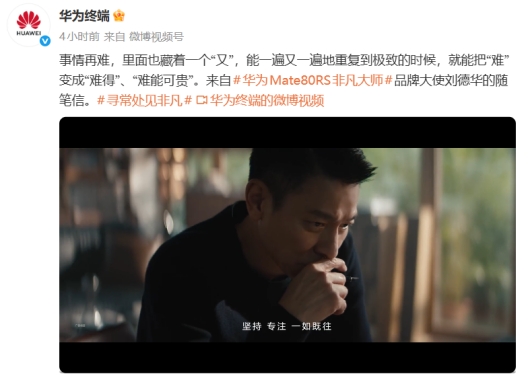 11月25日,科技界迎来了一场备受瞩目的发布会——华为正式推出新款超高端旗舰手机华为Mate 80 RS 非凡大师。当天,品牌大使刘德华通过个人视频《刘德华的一封随笔「信」》,以其完成72场巡回演唱会的经历,向观众分享了一个朴素而深刻的人生感悟:“如果没有天赋就一直重复”。这句看似简单的话语,蕴含着耐人寻味的深意:在这个浮躁的时代,唯有保持纯粹的初心和专注的态度,才能在日复一日地坚持中,淬炼出真正的非凡。