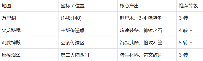 关键玩法:万尸洞杀 10 只「腐肉尸王」学赶尸术;主城「二丫」领主线解锁赞助特权;火龙秘境「烈焰主宰」(3 人组队)掉攻速戒指,沉默神殿「沉默教主」(戴抗沉默项链)掉倍攻斗笠