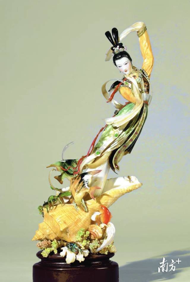 方友创介绍,相对其他雕刻艺术选材的单一性,贝雕的选材更为复杂,技艺难度大。由于贝壳的颜色、质地、纹理形状和大小各不相同,变化万千,工艺师们需要提前进行设计和搭配。贝雕制作工序繁多,集合设计、选料、雕刻、打磨、组装、装配、镶嵌、塑形等技术于一体,更是融合了绘画、雕塑等各项艺术,非精湛技法者难事其艺。