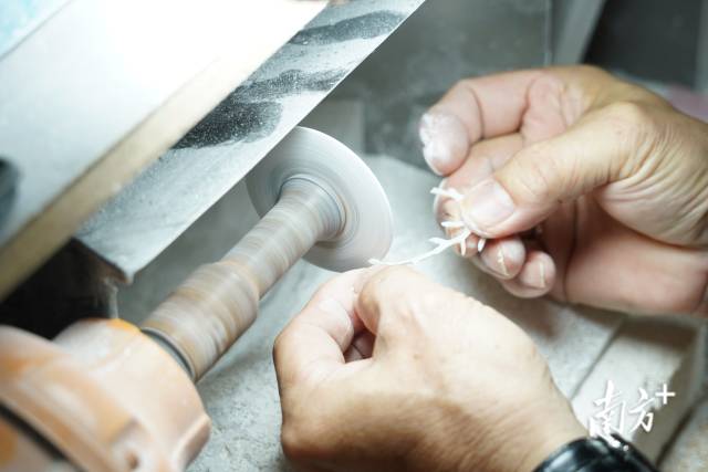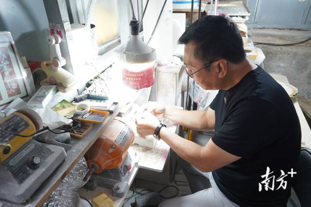 走进方友创家的工作室,尖利的砂轮摩擦贝壳的声音传来,方友创正在忙碌着。他回忆起以前在工厂做贝雕时,工人在流水线里忙碌,负责其中的每个环节。现在的他能独立完成制作的全过程。