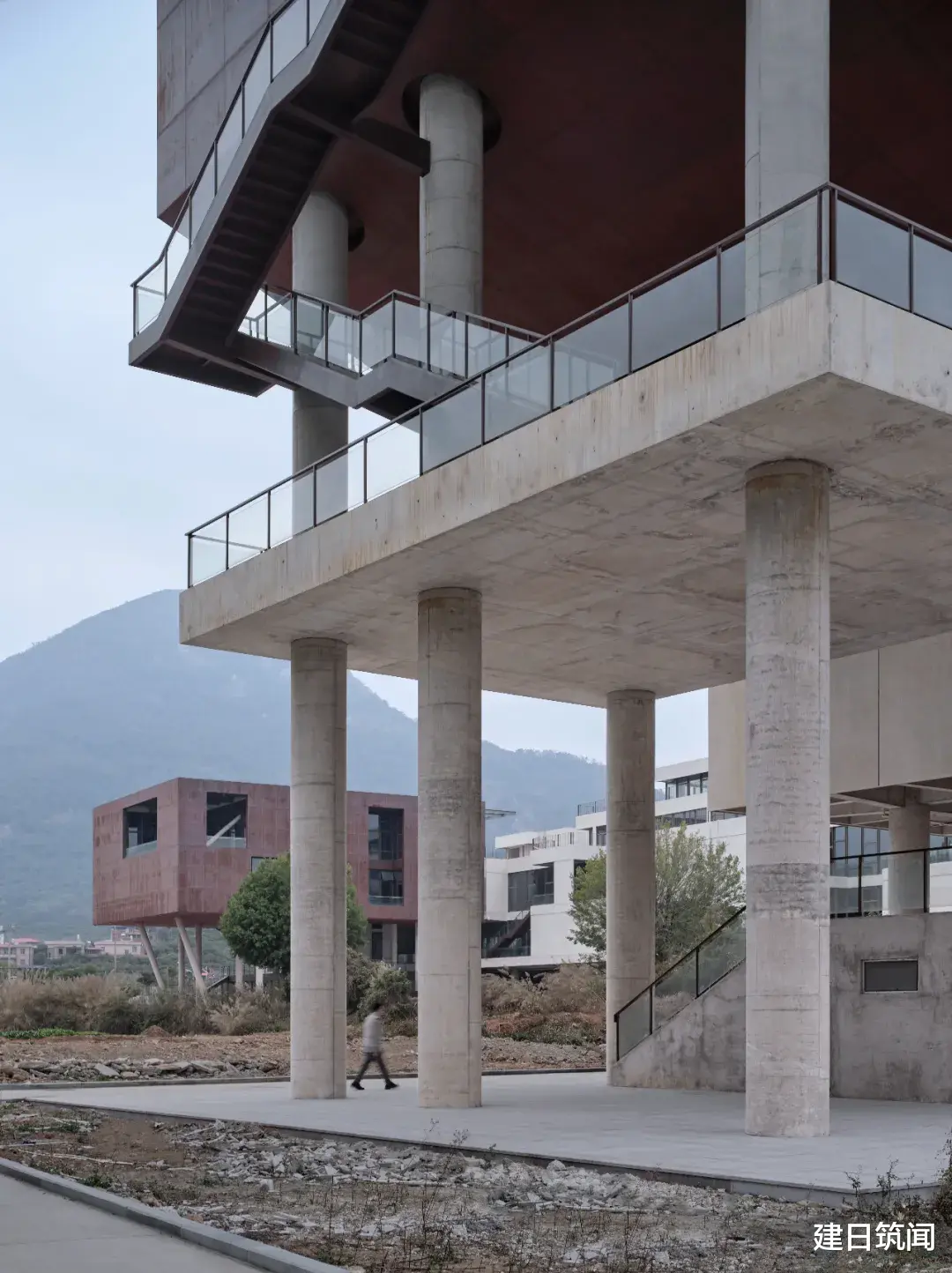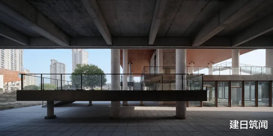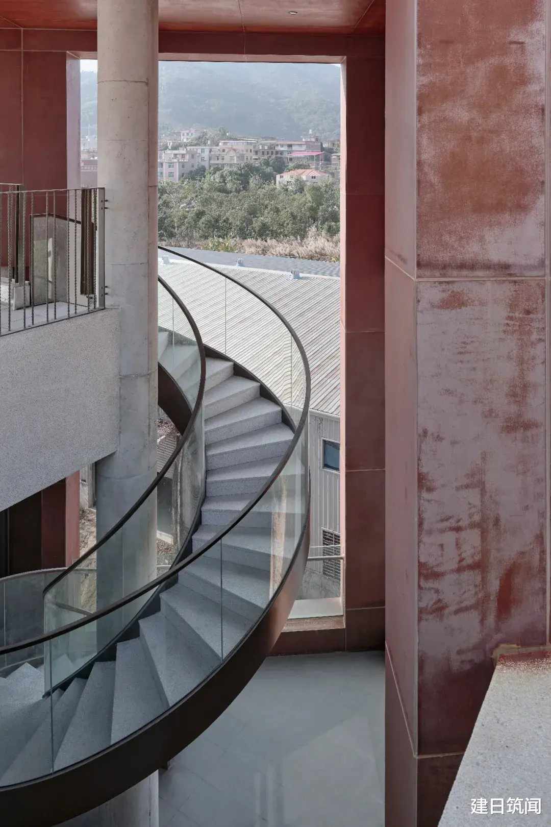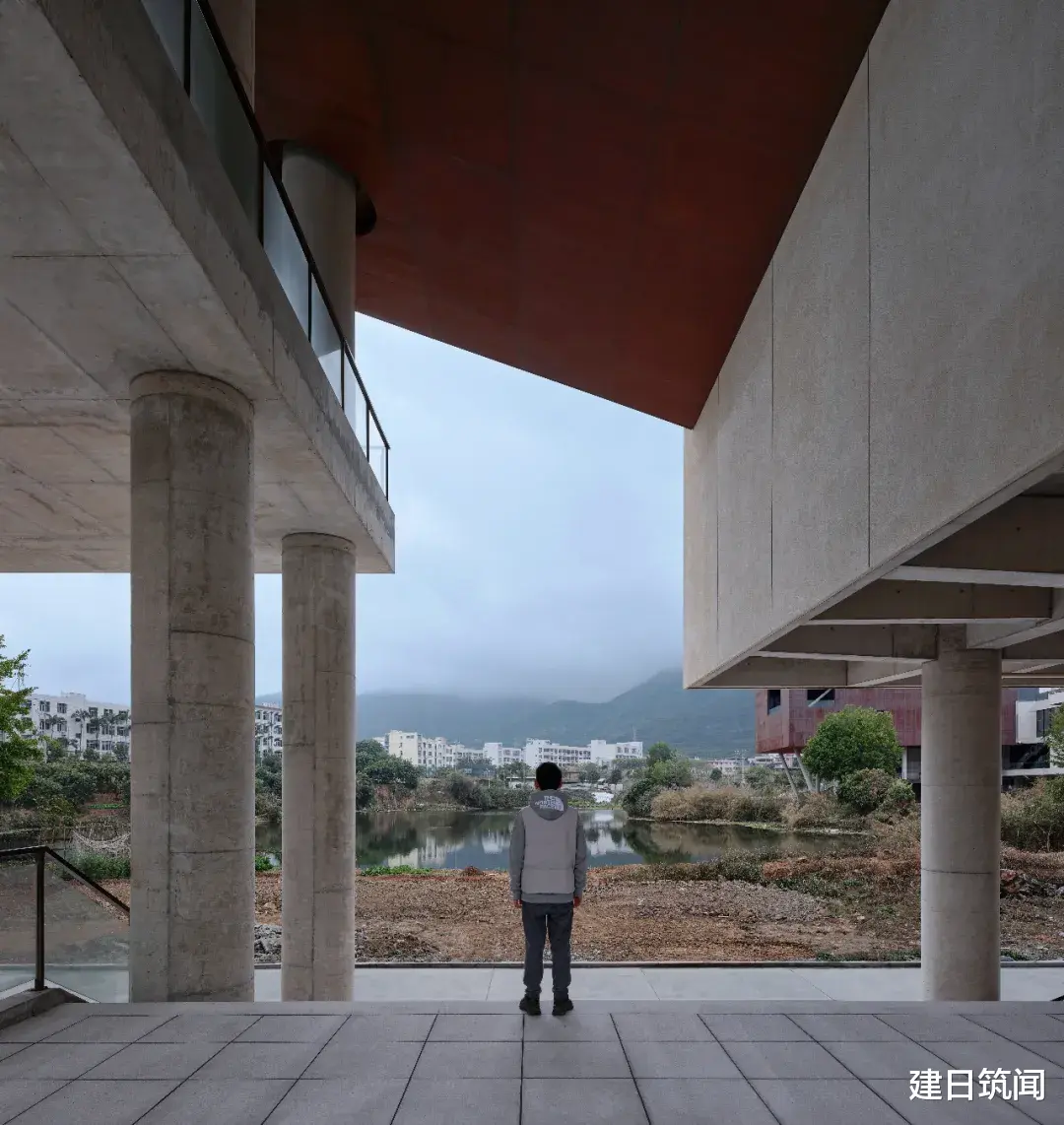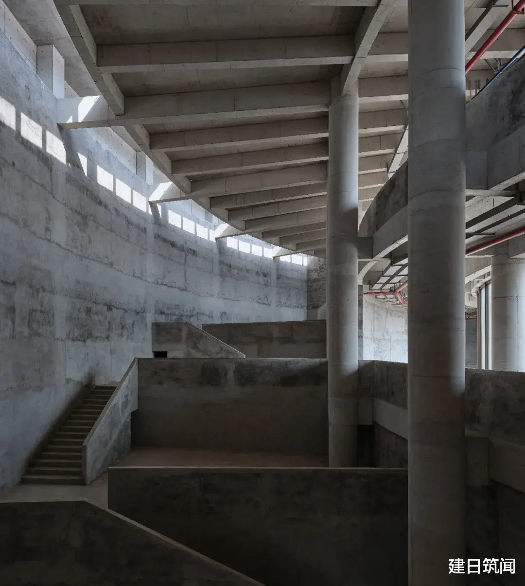 灰空间的流动性建构由于场地标高有变化,建筑底层层高是 5.1 米 - 6.9 米通高架空,植入可移动展墙系统,使生产场景本身成为展演内容。中部展厅盒子的 18 根清水混凝土柱形成“柱林广场”,既可举办户外发布会,又能在雨季转化为闽南“骑楼”式灰空间。