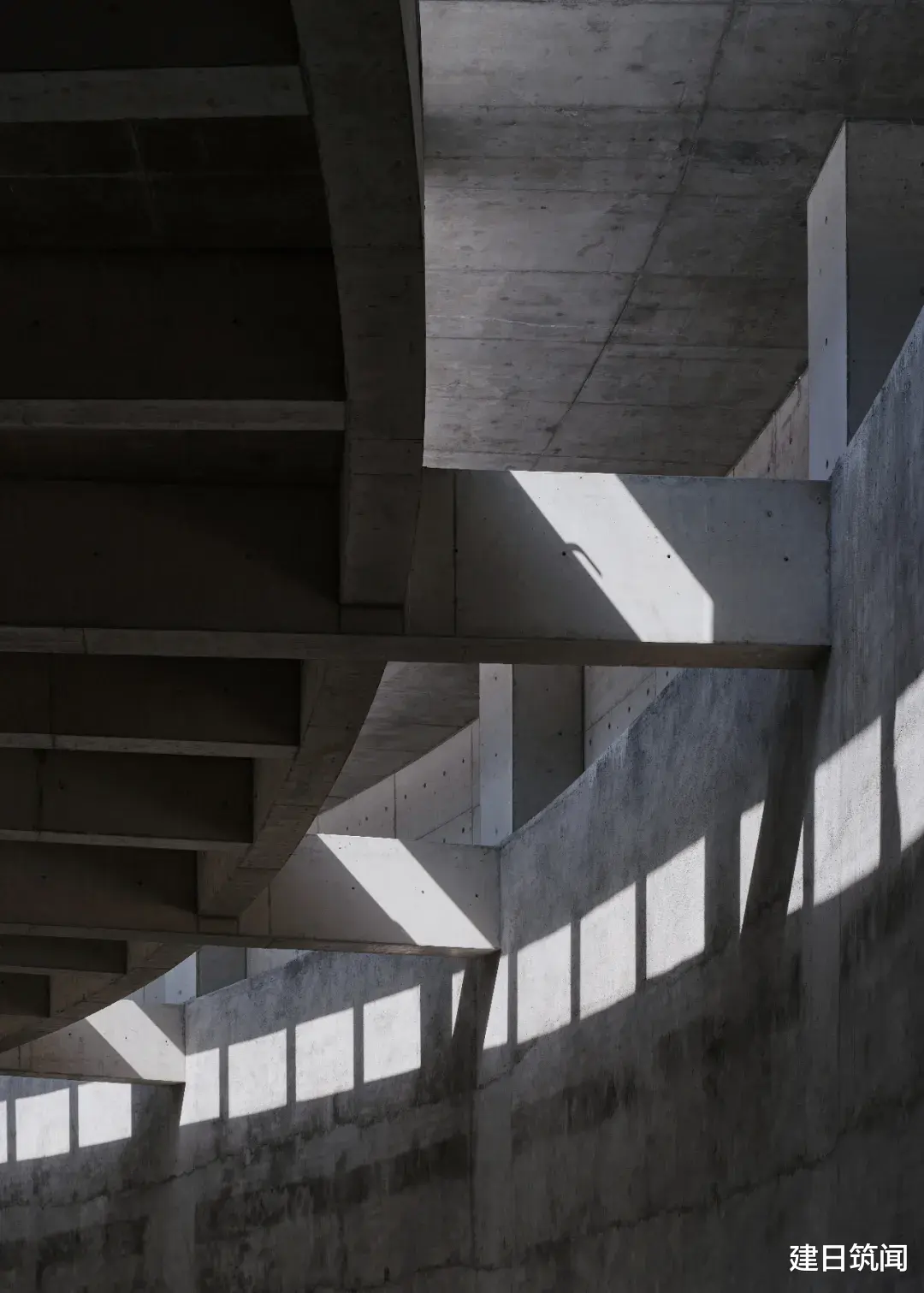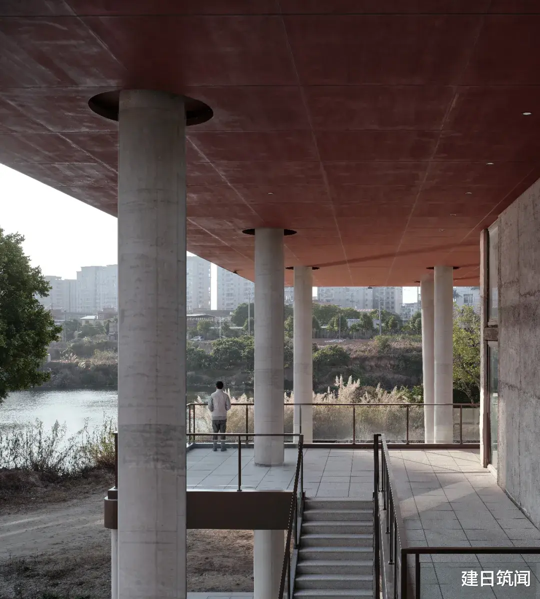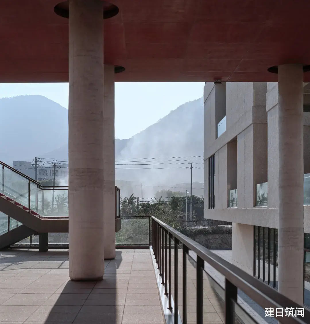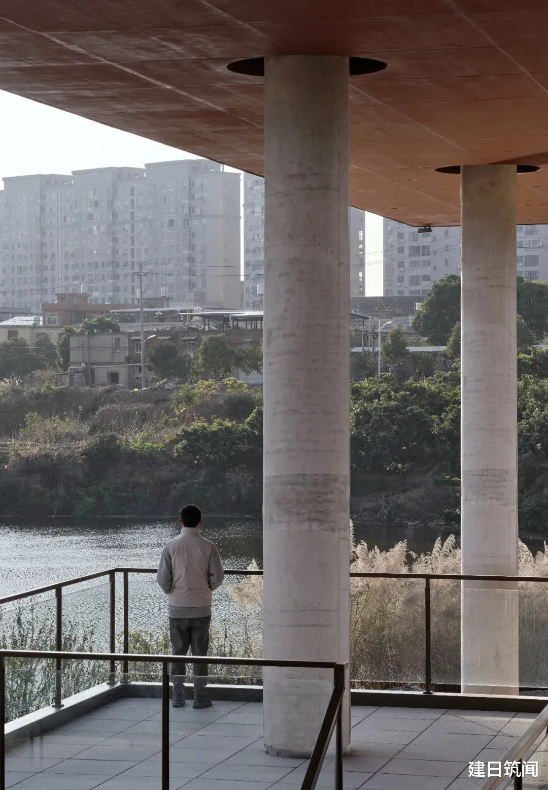灰空间的流动性建构由于场地标高有变化,建筑底层层高是 5.1 米 - 6.9 米通高架空,植入可移动展墙系统,使生产场景本身成为展演内容。中部展厅盒子的 18 根清水混凝土柱形成“柱林广场”,既可举办户外发布会,又能在雨季转化为闽南“骑楼”式灰空间。
