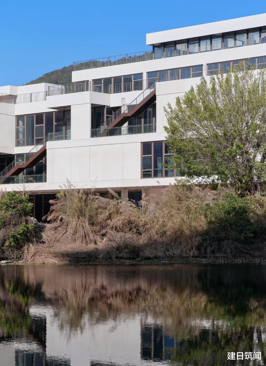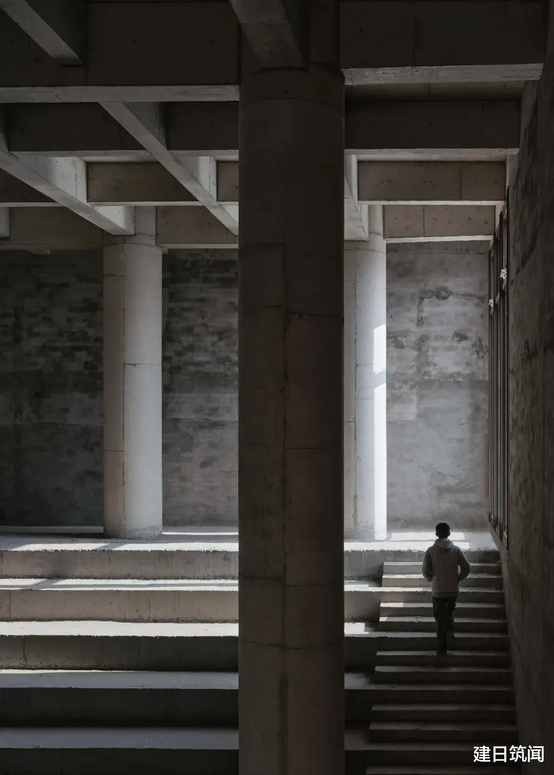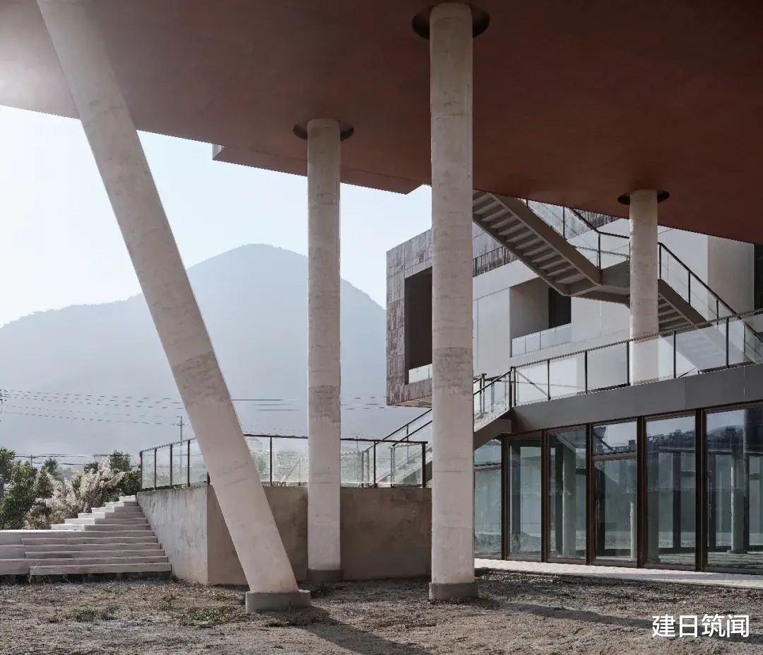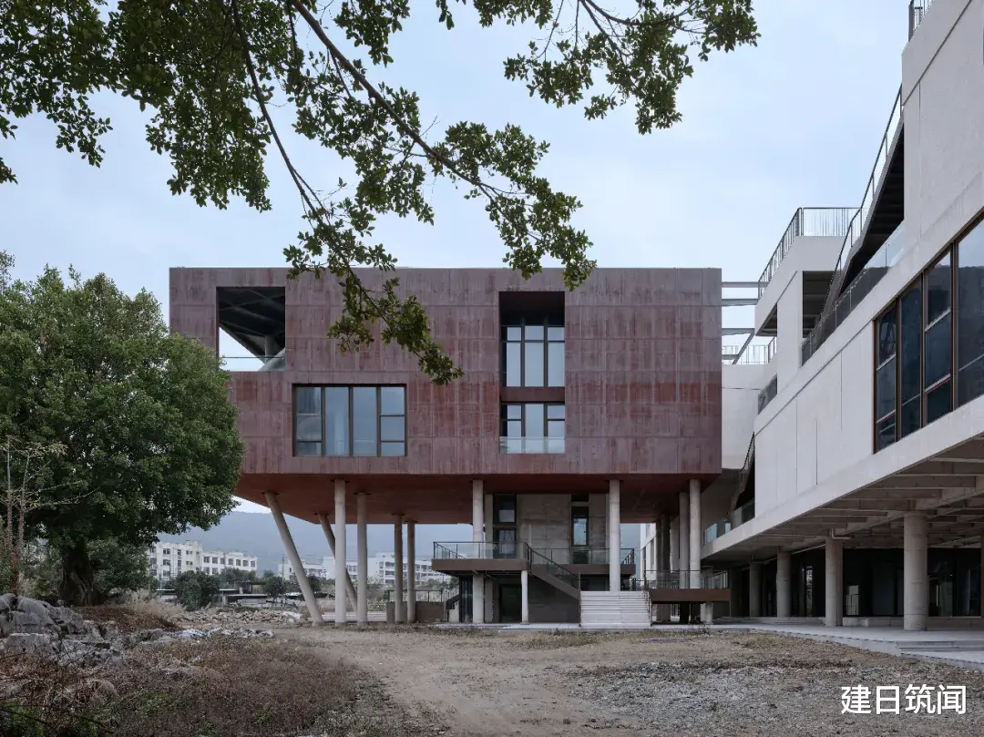 灰空间的流动性建构由于场地标高有变化,建筑底层层高是 5.1 米 - 6.9 米通高架空,植入可移动展墙系统,使生产场景本身成为展演内容。中部展厅盒子的 18 根清水混凝土柱形成“柱林广场”,既可举办户外发布会,又能在雨季转化为闽南“骑楼”式灰空间。