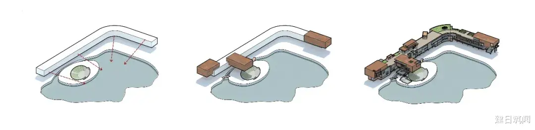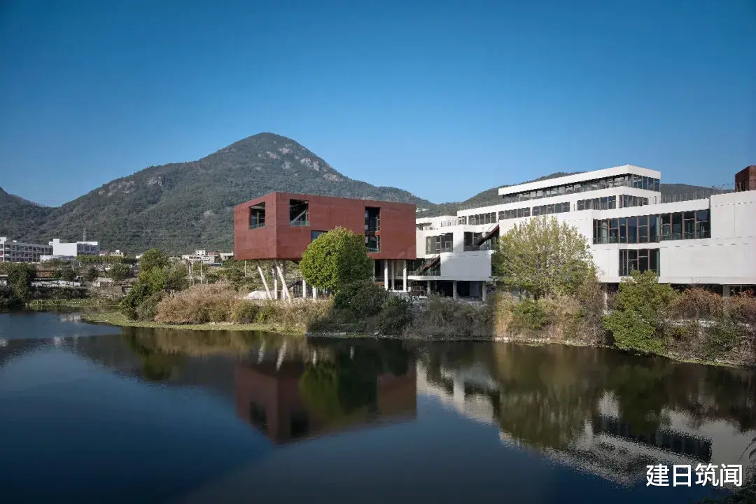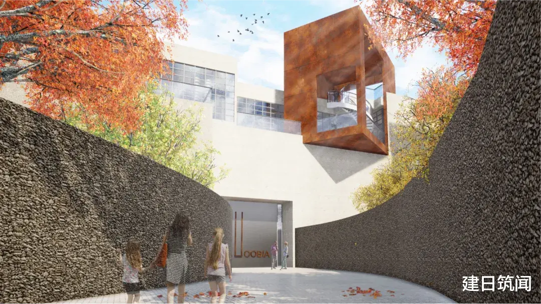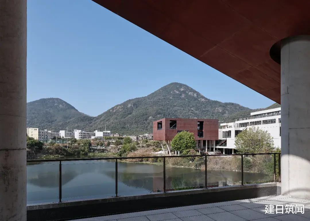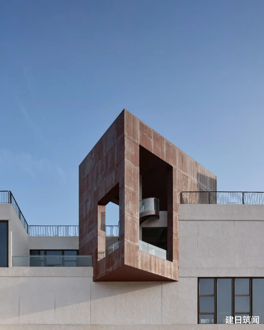 3.空中链接轴:四个耐候钢盒子通过悬挑连廊相接,在 15.5 米标高形成观山廊道,与清源山摩崖石刻形成古今对话。