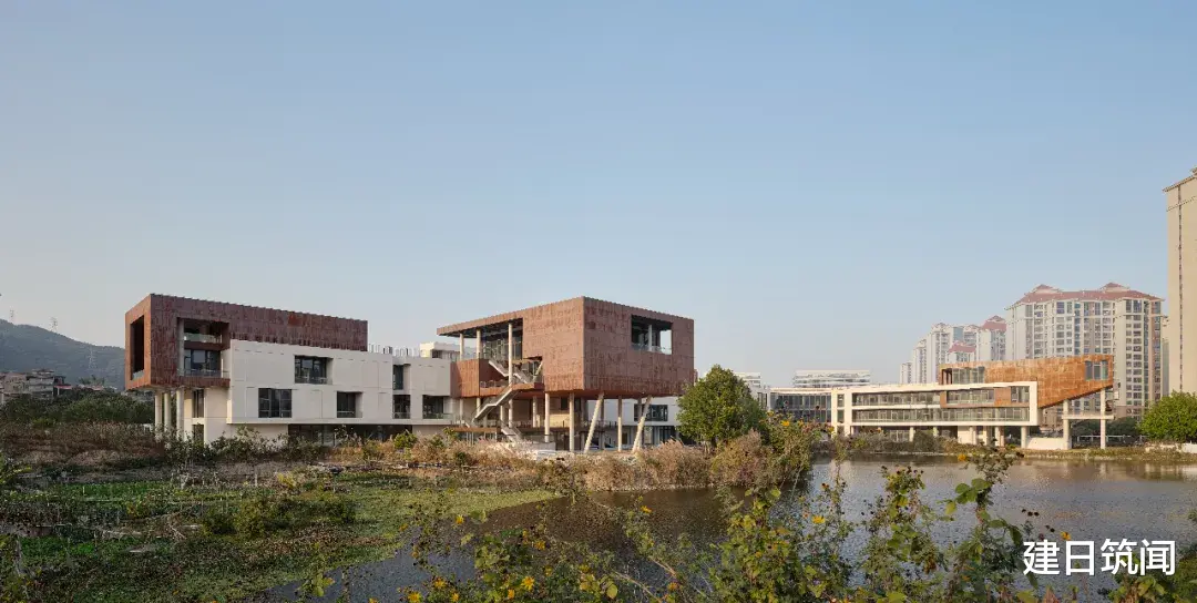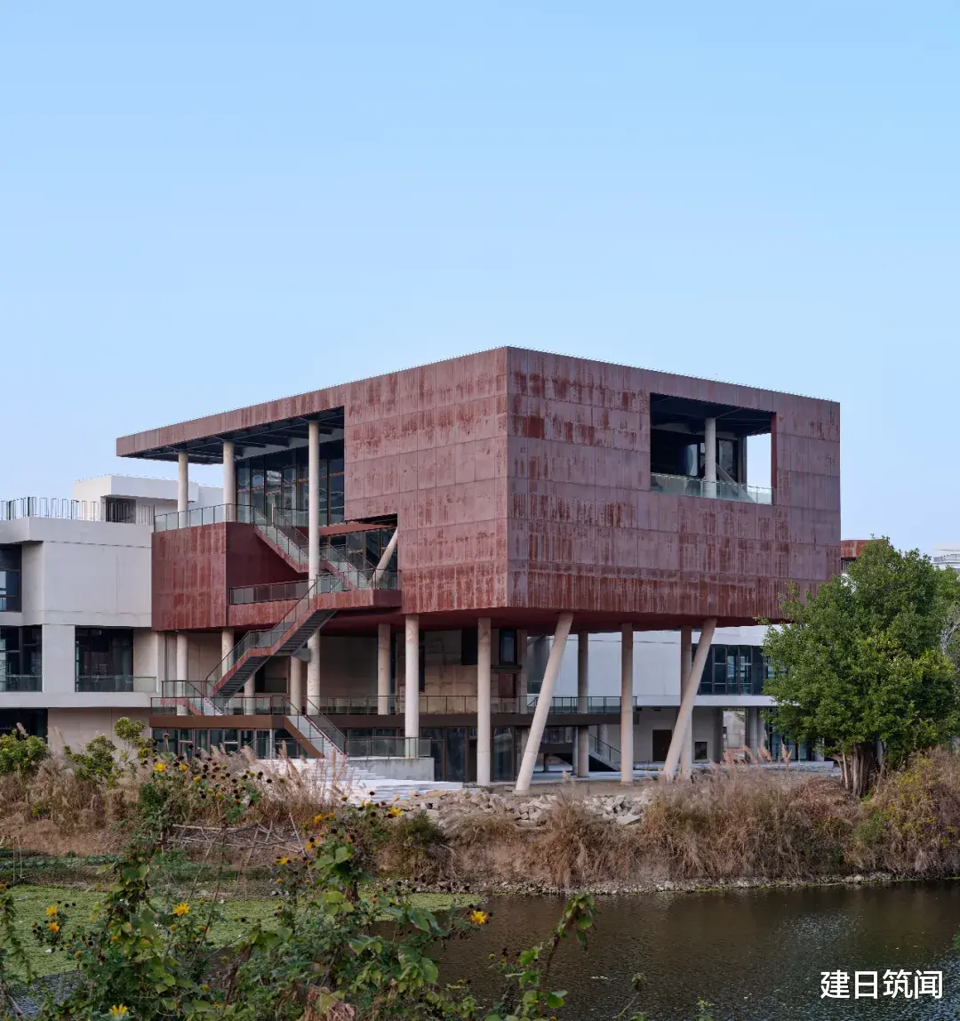 耐候钢板四个功能盒子采用耐候钢,其氧化产生的赭红色泽,恰似闽南红砖厝的现代演绎,随时间推移呈现动态美学;盒子代表着中国游园的亭、台、楼、阁 ,传统的园林是平面布局,在这里我们是空间立体布局。