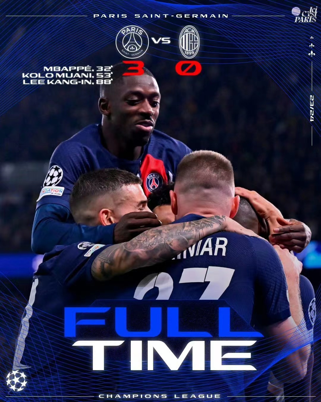 在这个充满激情和期待的时刻,世界再次见证了巴黎圣日耳曼的荣耀。他们的身影闪耀在绿茵场上,他们的壮举点亮了整个夜空。姆巴佩、穆阿尼和李刚仁,你们的名字将被载入足坛史册。而巴黎圣日耳曼,你们的荣耀将永远闪耀在人们的心中。让我们期待着,更多的壮举,更多的荣耀!