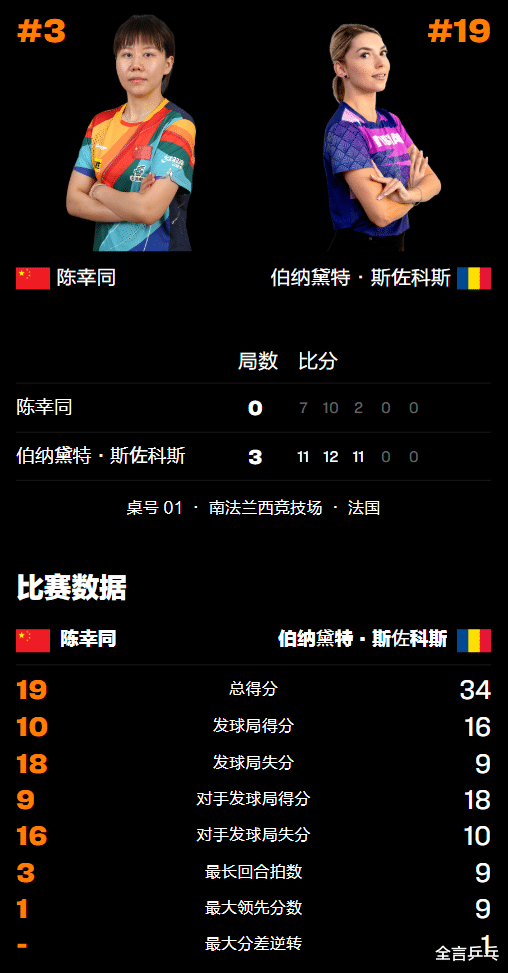 北京时间10月28日晚,国乒迎来WTT法国蒙彼利埃冠军赛的首场对决,女单头号种子陈幸同率先登场迎战罗马尼亚名将斯佐科斯,结果陈幸同一局未赢0-3被淘汰,而且单局出现1-10、2-11的悬殊分差,由此而止步女单第一轮32强,详细战况请看下文。