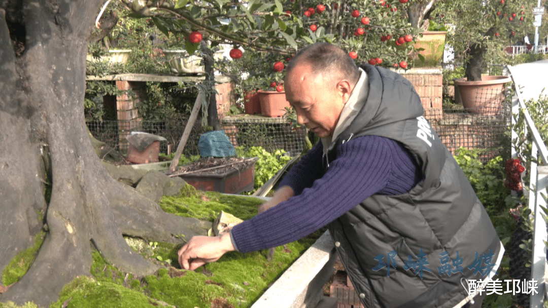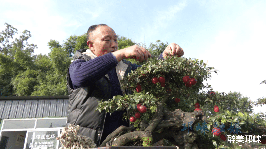 在临邛街道西江村的金弹子盆景园内,形态各异的盆景错落分布,虬曲的枝干尽显自然意趣。龙远洋正俯身修剪枝叶,动作专注而娴熟。