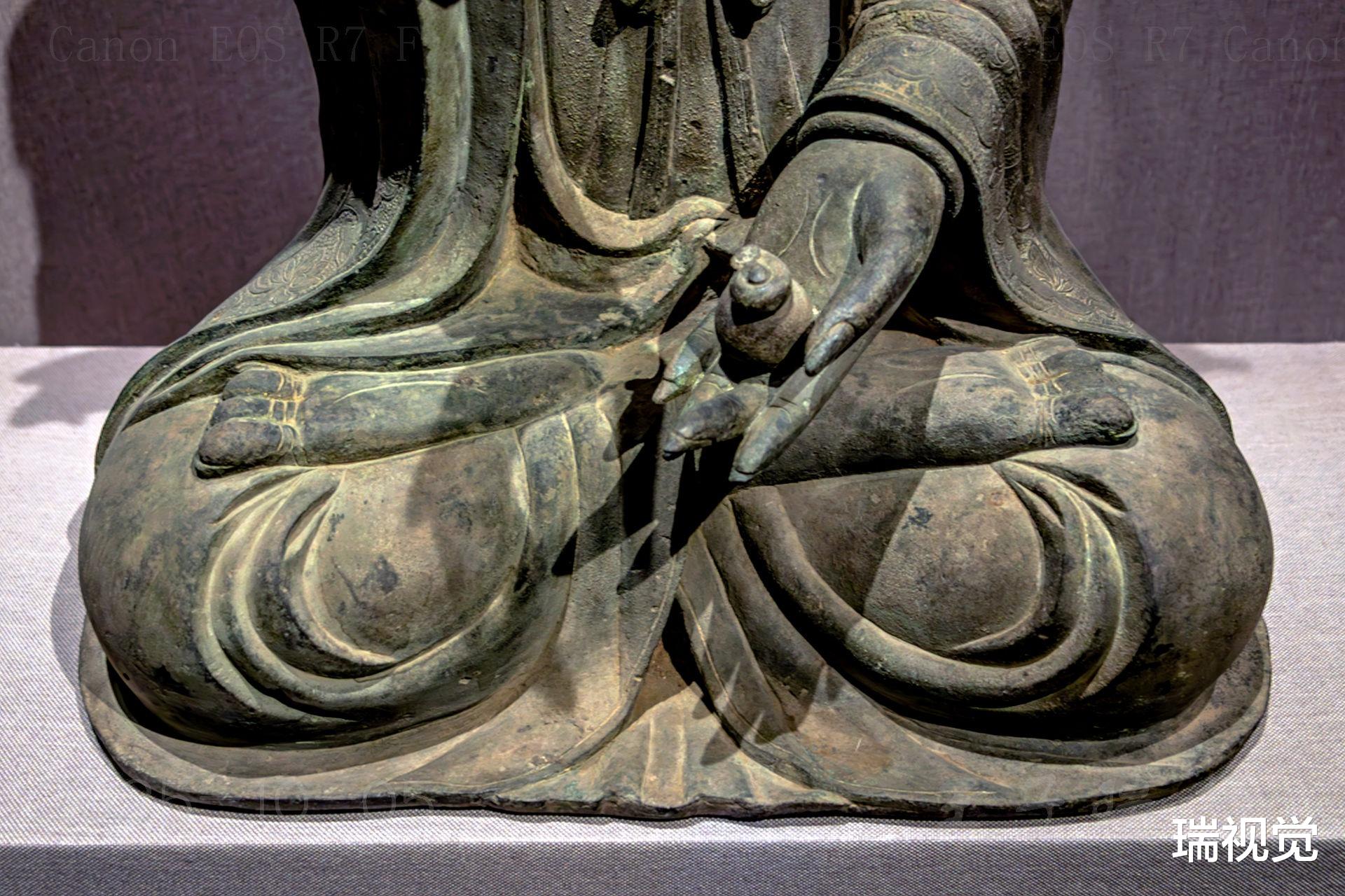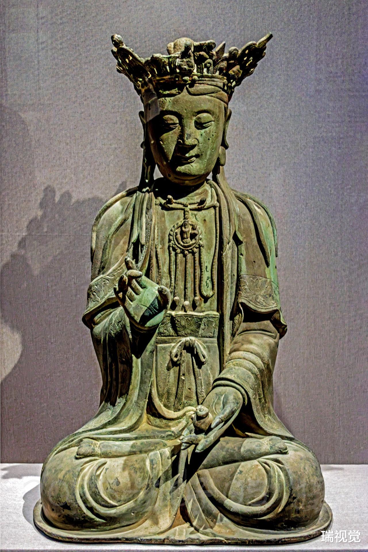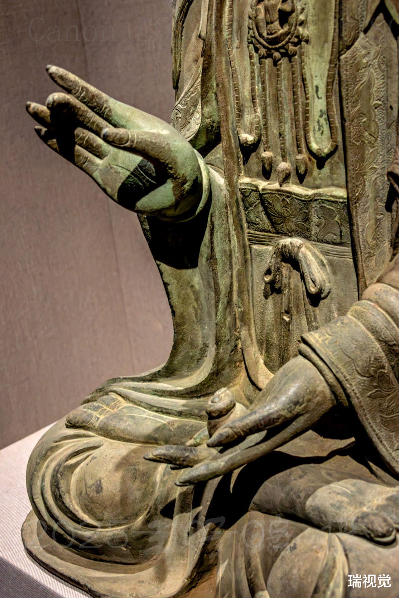 菩萨身姿挺拔,肩披帔帛,衣褶层叠流转,线条柔和中见力度,虽为铜铸,却仿佛有织物的垂坠质感。