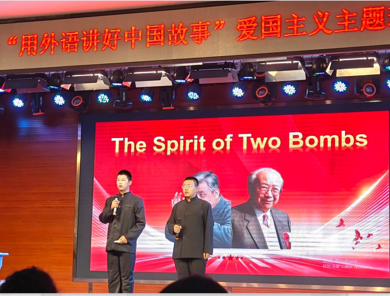 在展示活动现场,李明锐、黄子谦同学以“两弹精神”为核心,进行了深情并茂的演讲。他们的演讲内容紧密依托绵阳作为“两弹一星”精神重要孕育地的独特历史文化底蕴,并创新性地采用了角色扮演的形式。两位同学不仅是故事的讲述者,更化身年老的邓稼先与钱三强两位功勋科学家,通过巧妙的情节设计和生动的语言表达,将厚重的历史叙事与崇高的精神传承融为一体,实现了本土红色文化资源与国际性外语表达的精彩碰撞,令人耳目一新。