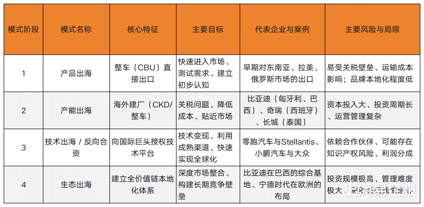 02中国汽车出海模式的演进与分类与保时捷在中国市场的收缩形成鲜明对比的,是中国汽车制造商波澜壮阔的全球化征程。中国的“出海”并非单一的战略行动,而是一个复杂的、分阶段的演化过程。