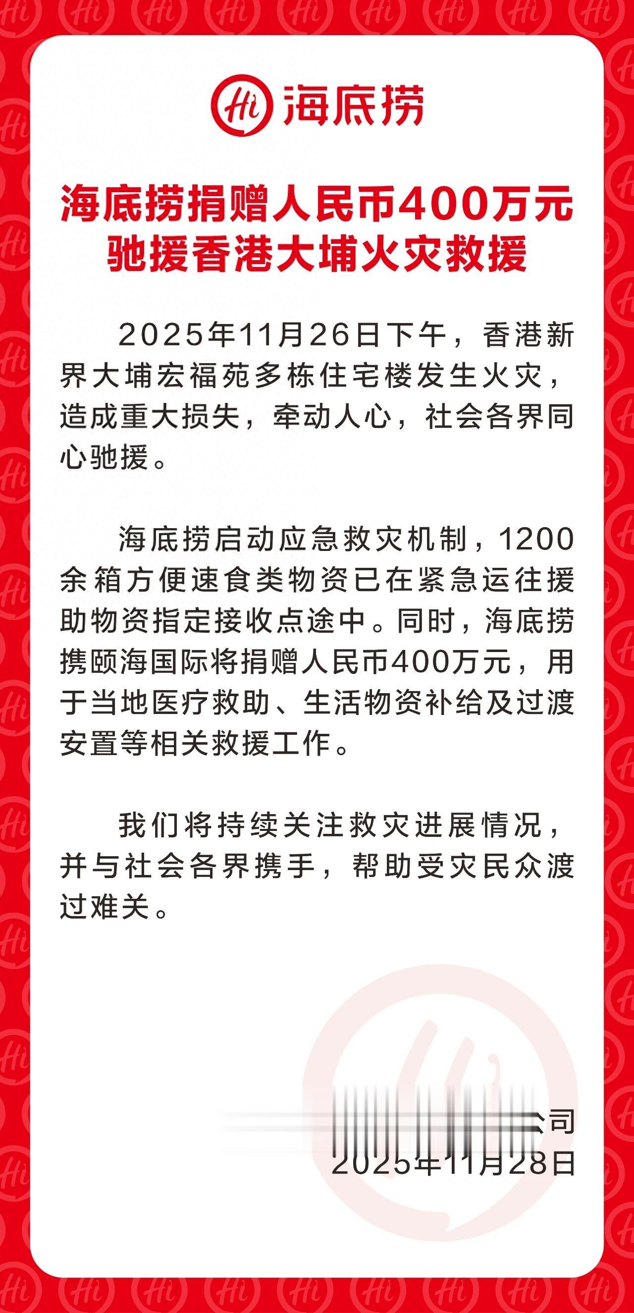 新京报讯(记者王萍)近日,香港新界大埔宏福苑多栋住宅楼发生火灾。11月28日,新京报记者获悉,海底捞启动应急救灾机制,1200余箱方便速食类物资已在紧急运往援助物资指定接收点途中。同时,海底捞携颐海国际将捐赠人民币400万元,用于当地医疗救助、生活物资补给及过渡安置等相关救援工作。海底捞表示,将持续关注救灾进展情况,并与社会各界携手,帮助受灾民众渡过难关。