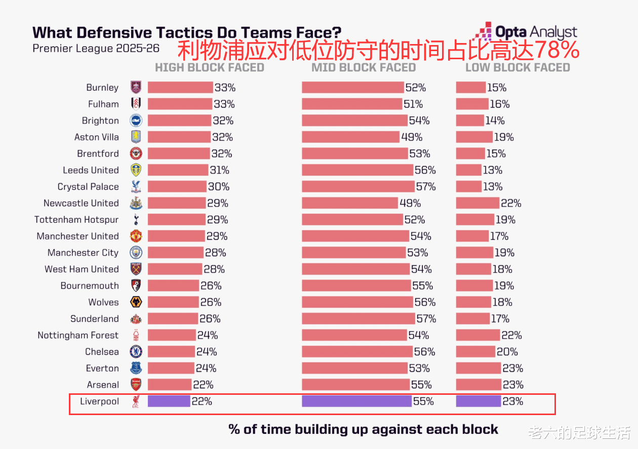 利物浦所有比赛里在面对中低位防守阵型的时间占比高达78%,是联赛里最高的。