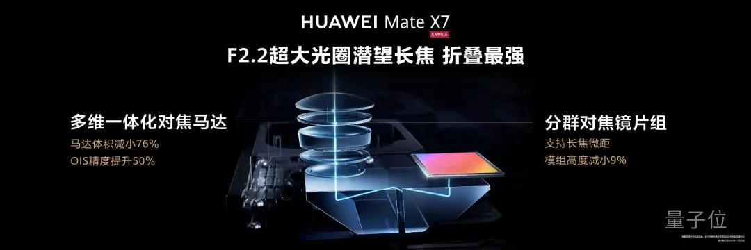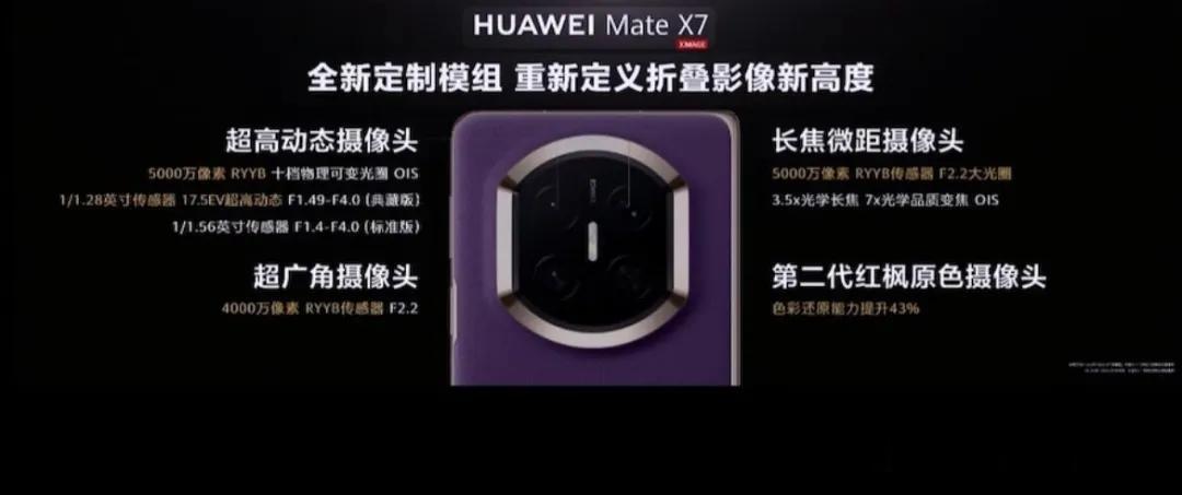 Mate X7在长焦上了5000万像素RYYB长焦微距镜头,F2.2大光圈,3.5×光学长焦+7×光学品质变焦,支持OIS。