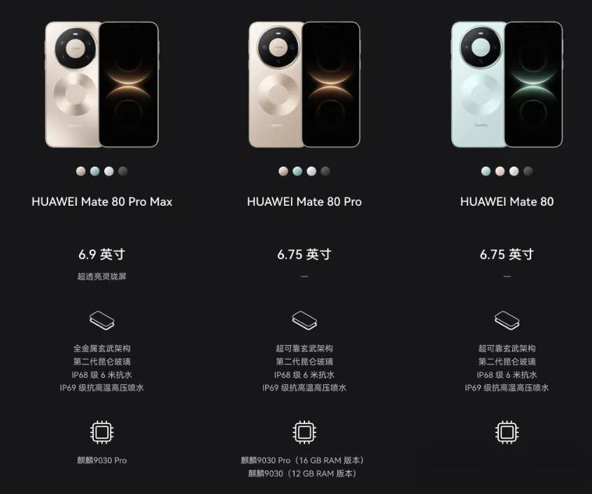 官网信息显示,Mate 80 Pro 12GB内存版搭载了全新的麒麟9030芯片,Mate 80 Pro 16GB内存版和Mate Pro Max以及Mate X7搭载了麒麟9030 Pro芯片。