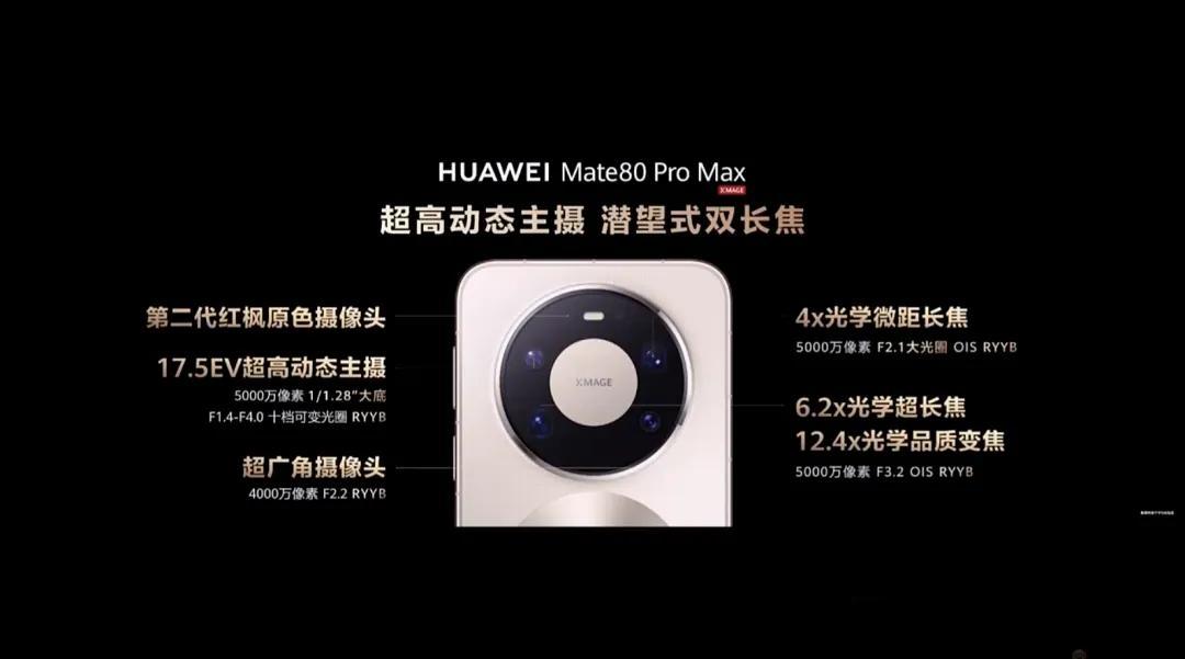 在标准版Mate80上,搭载了第二代红枫原色摄像头系统。主摄为5000万像素的“超光变主摄”,支持F1.4-F4.0十档物理可变光圈、OIS光学防抖以及RYYB传感器。