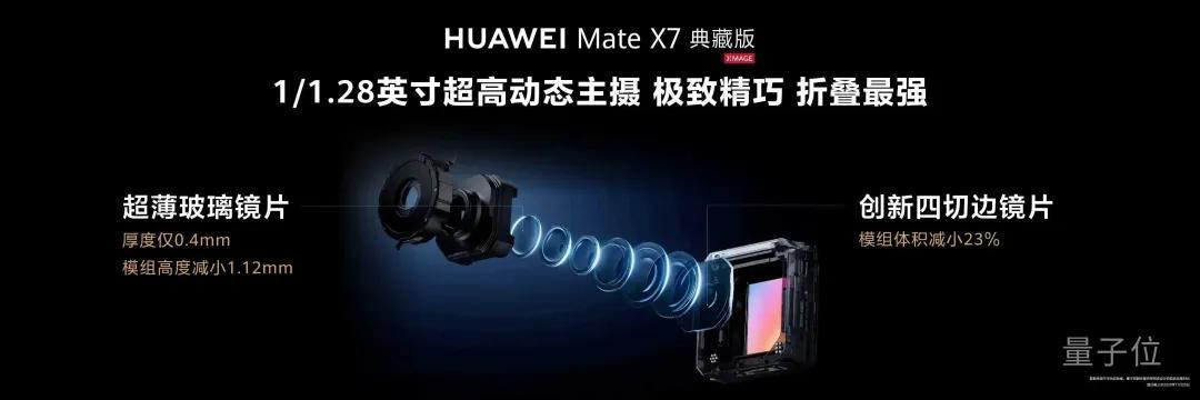 Mate X7 的主摄采用全新的“超光变”镜头模组,通过四切片镜片与0.4mm行业超薄玻璃的组合,在光学结构上进一步压缩体积,同时减轻重量,实现更高的整机集成效率。简单讲,就是光学性能更强,模组更薄更轻,为折叠机的轻量化做了巨大贡献。