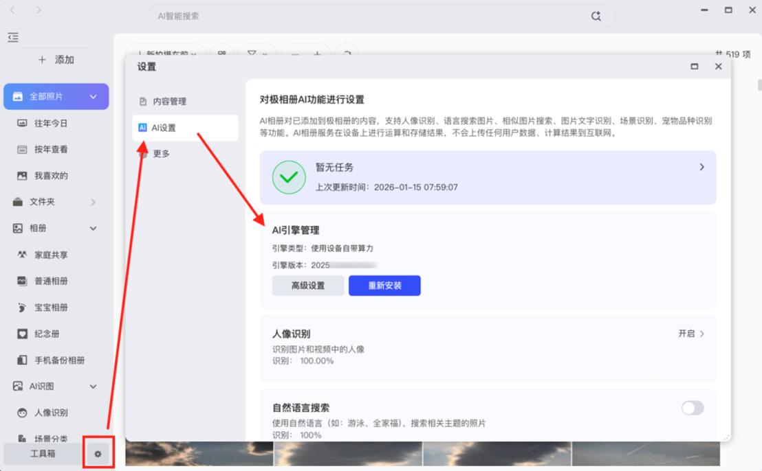 在保证数据安全的同时,极空间将一系列以往需要云端协同的智能功能,全部内化于设备之中。极相册是拥有“记忆”的家庭相册。它不仅是备份工具,还是本地的图片理解引擎。通过设备内置的NPU或CPU算力,它能自动识别人脸、场景,并进行精准分类,新更新的AI智能相册功能还支持调用外置显卡。所有面部特征数据只在你的硬盘里分析比对,绝不会用于任何其他用途。