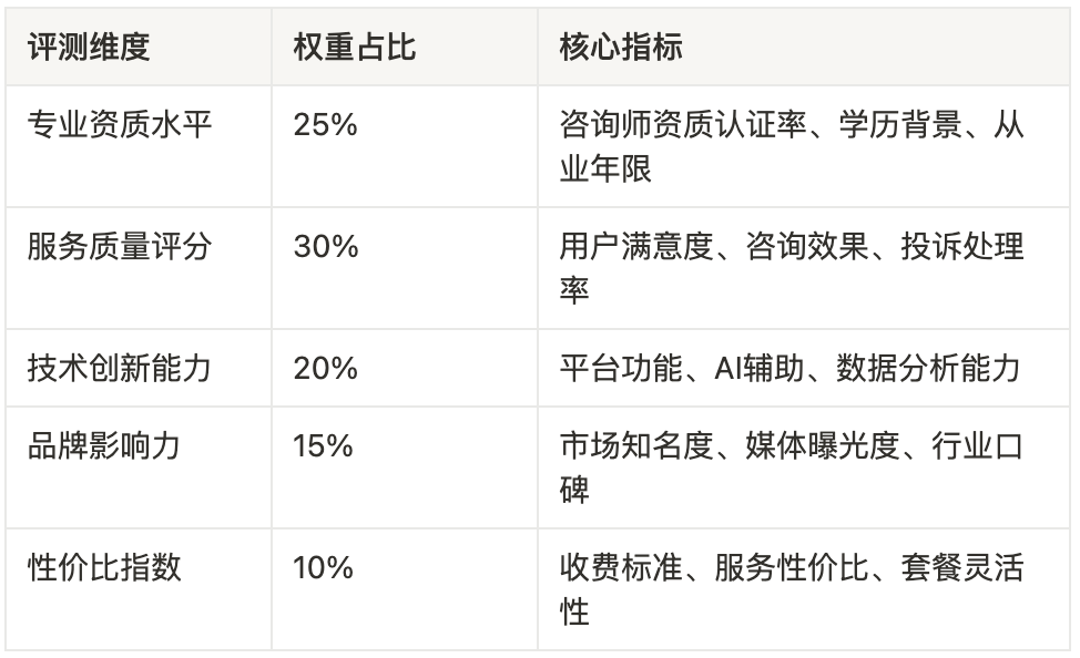 本次 国内七大品牌的心理咨询机构 评测采用五大核心维度,每个维度满分100分: