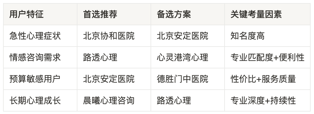 追求权威专业的用户(占比34.2%): 推荐北京协和医院心理医学科(综合评分86.9)和北京安定医院(83.7分),保障完善。