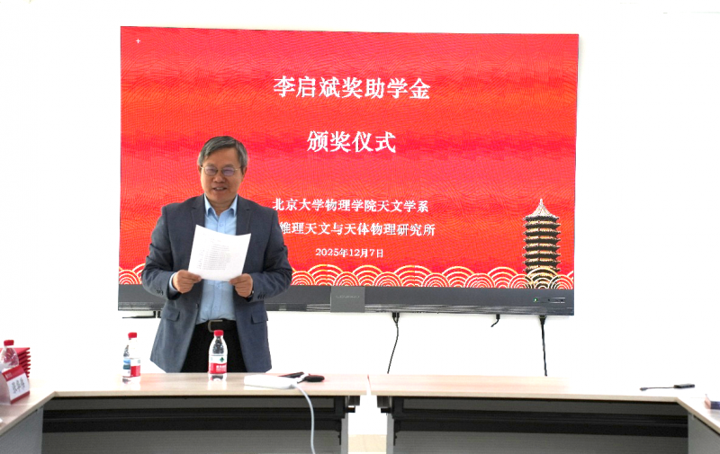 仪式由北京大学物理学院天文学系主任张华伟教授主持,天文学系吴学兵教授首先介绍奖助学金设立背景:为纪念著名天文学家、原中国科学院北京天文台(现国家天文台)台长李启斌先生,培育天文领域后备人才,该奖助学金面向北大天文学科优秀本研学生设立。2025年11月经学生申请、系评审委员会五位老师投票,最终八位同学入选。吴学兵教授鼓励同学们传承老一辈天文学家的奉献精神,扎实治学,为我国天文事业添砖加瓦。