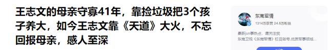 东南军情 2024-06-13 15:19 王志文的母亲守寡41年,靠捡垃圾把3个孩子养大,如今王志文靠《天道》大火,不忘回报母亲,感人至深