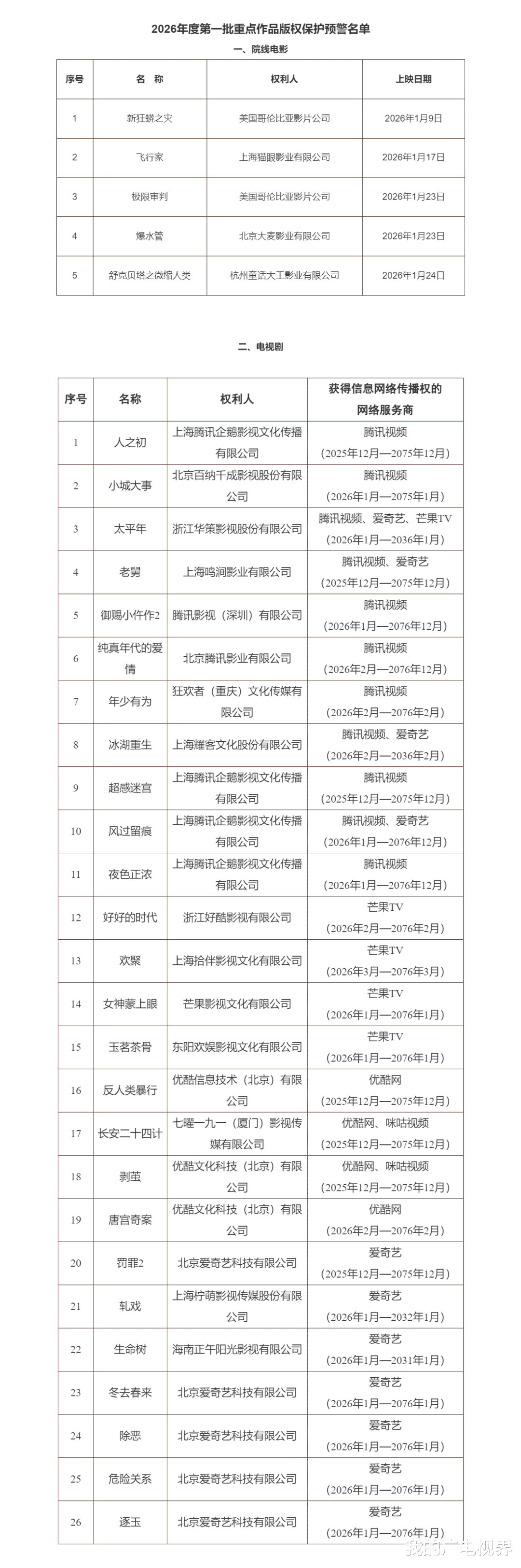 近日,国家版权局公布2026年度第一批重点作品版权保护预警名单,26部电视剧列入重点作品版权保护预警名单。