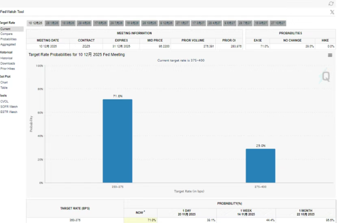 美联储三号人物威廉姆斯表示,“在不久的将来”降息可能是合理的,这提高了对12月降息的预期。根据CME“美联储观察”工具的数据,截至目前,美联储12月“降息25个基点”的概率升至71%,而此前这一概率不足40%。重要数据缺失让市场对美联储决策预期增加了极大不确定性。