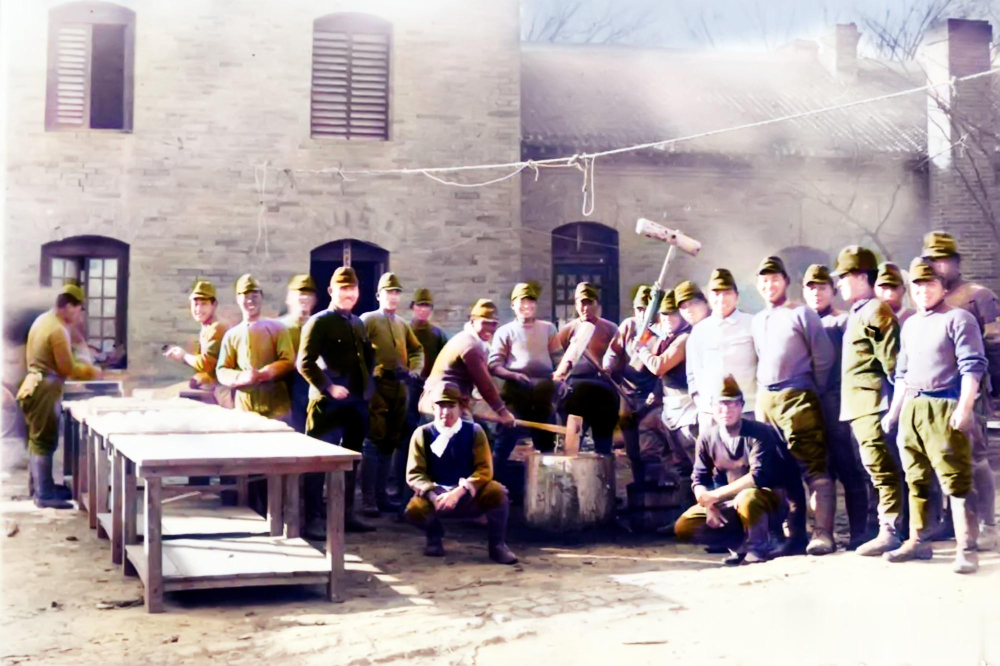 张庄教堂在献县东两里的地方,日本人一直怀疑这里是抗日据点。1941年9月,日本宪兵队突袭张庄教堂,逮捕数十名教会工作人员,并抢占教堂作为指挥部。图为1942年12月底,日军在张庄教堂院内聚众砸年糕,准备迎接新年的情景。