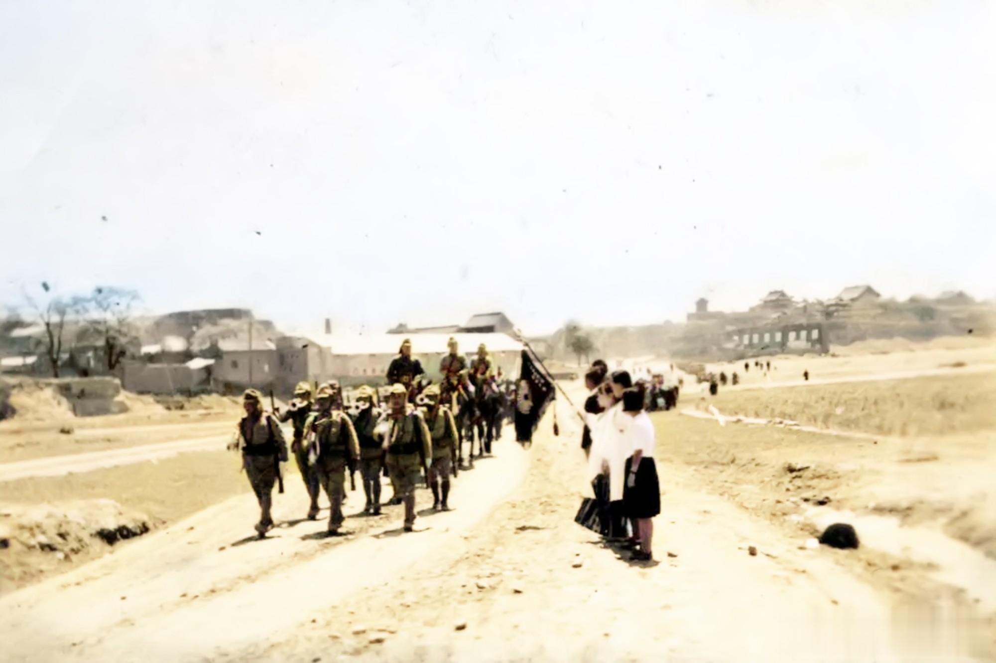 1942年8月,扫荡归来的日本士兵正在向献县城门走去,日本兵一边走,一边奏着军乐,以示凯旋。路边站在一排打着旗子欢迎的日本女学生。