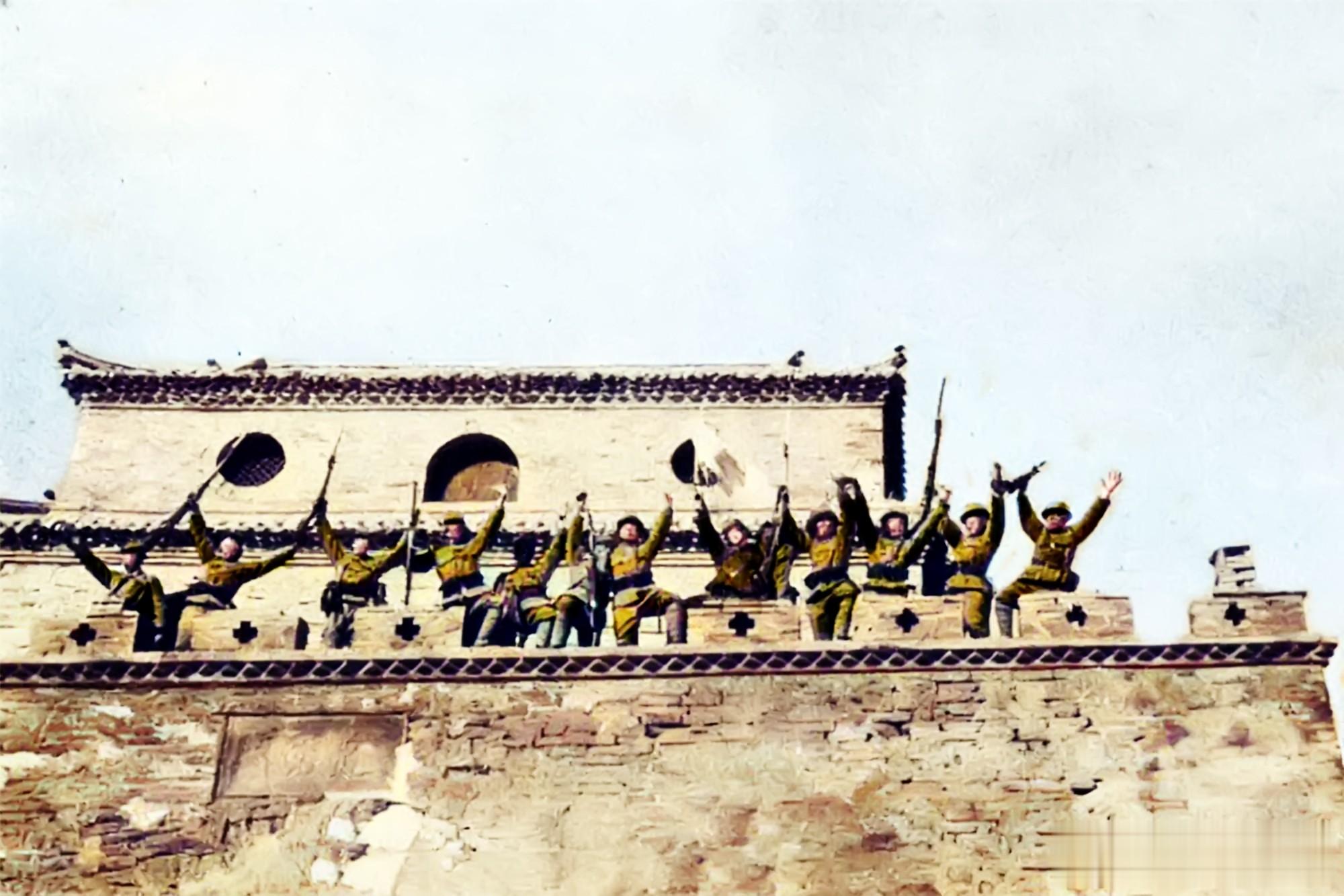 献县古城墙始建于金代,最初为土城。明成化二年改建为砖城,城墙周长六里,设四个城门,东西南北门分别叫东曰迎曙、对山、广济和拱极。图为站在献县东门城楼上,向东方欢呼的侵华日军。