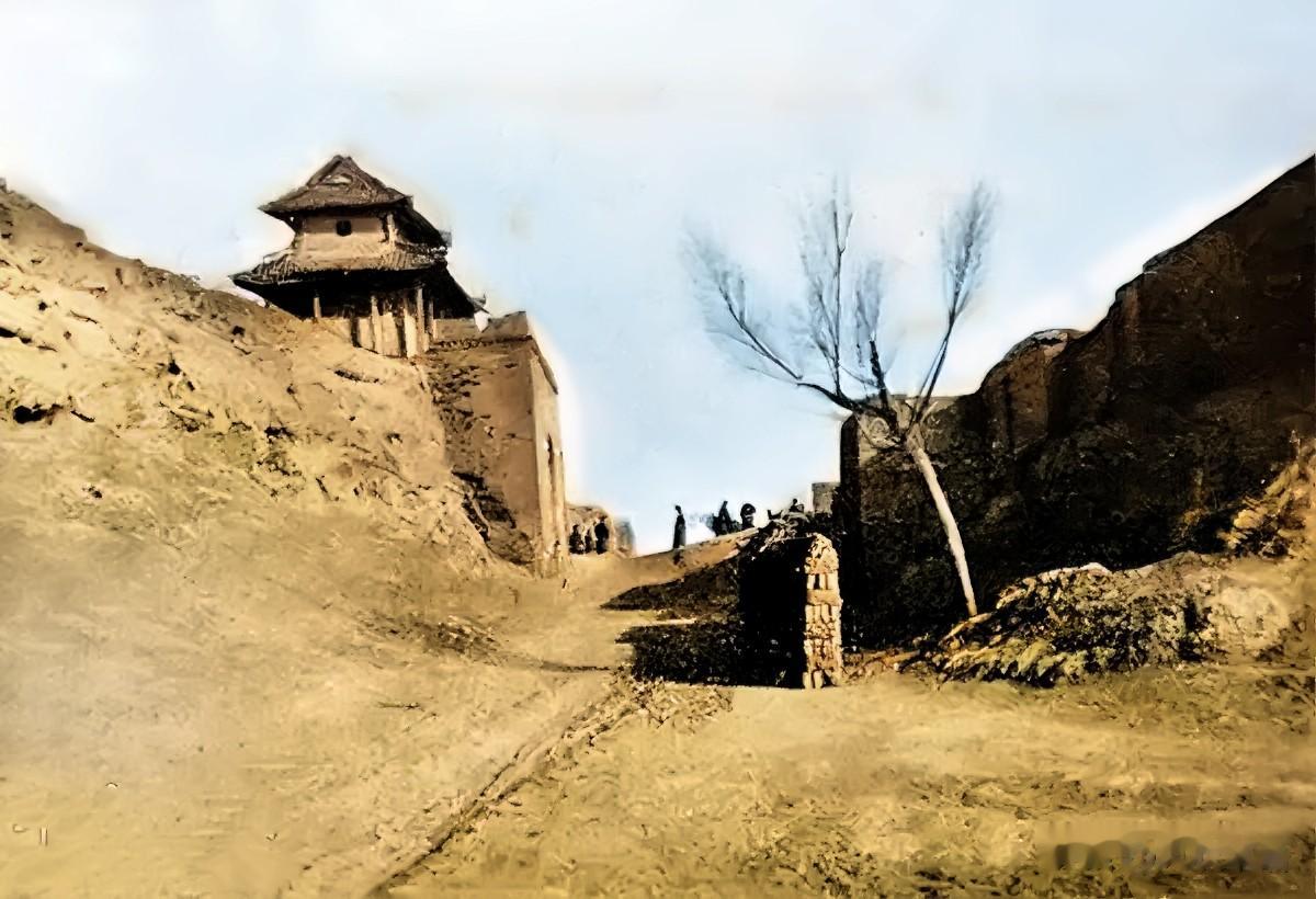 献县西城门外的景象。因为年久失修,城墙已经千疮百孔。画面中高耸的建筑是对山门城楼,城墙下是一条狭窄的道路,路面上留着深深的车辙。