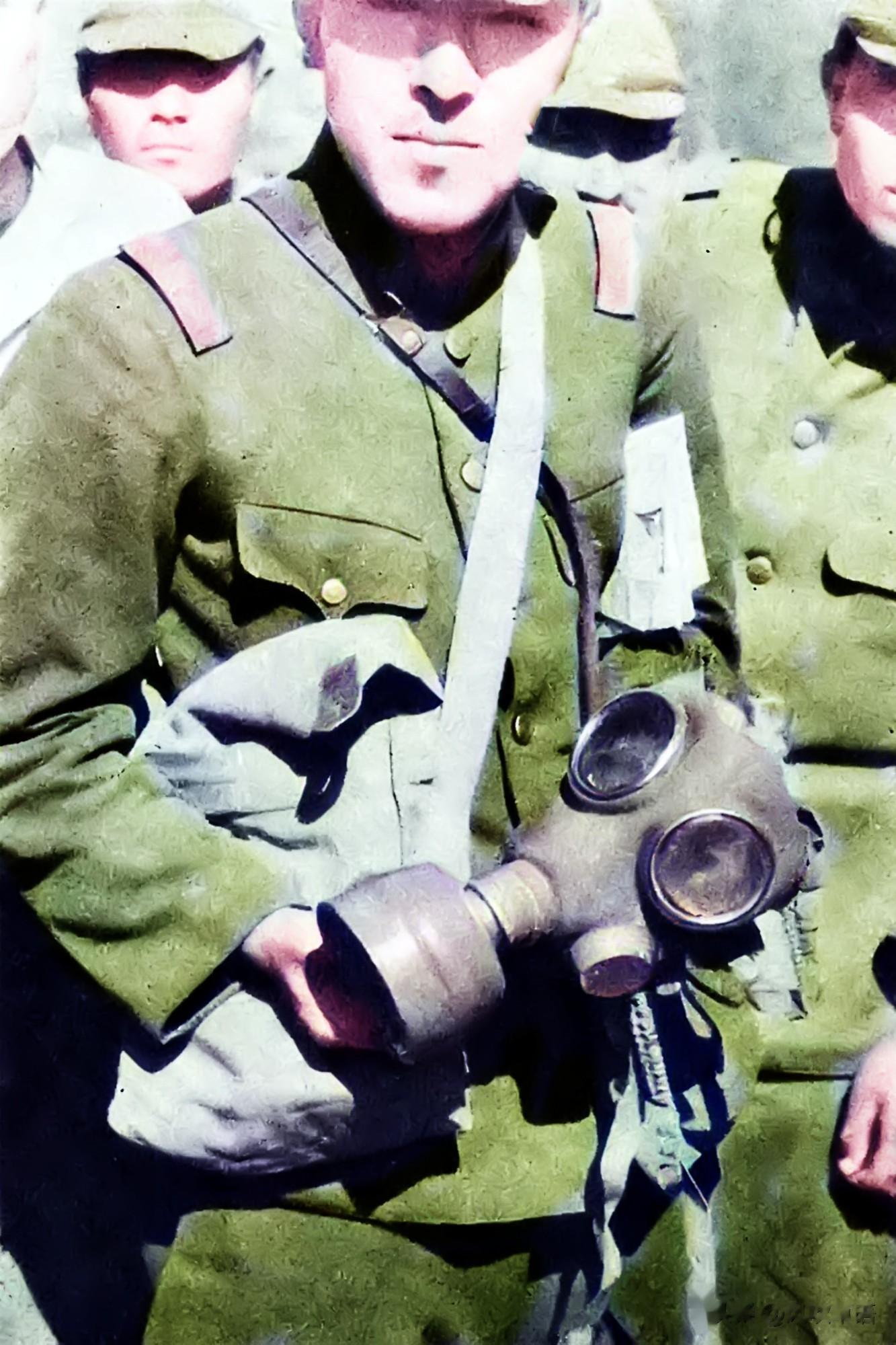 献县城内,一个日本士兵拿着中国守军遗落的防毒面具。日本在全面侵华期间,使用毒气超过两千次,造成数万中国军民伤亡。而整个二战期间,它几乎没有敢对美国和苏联使用毒气。
