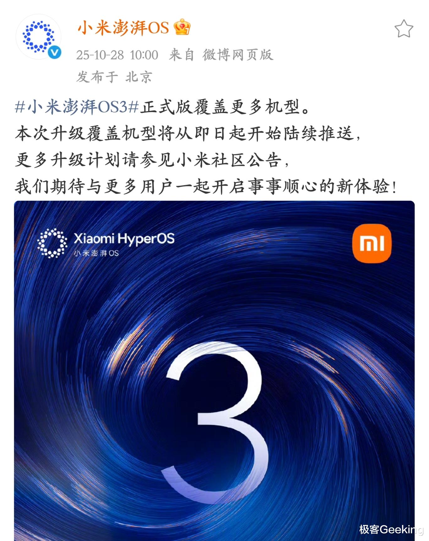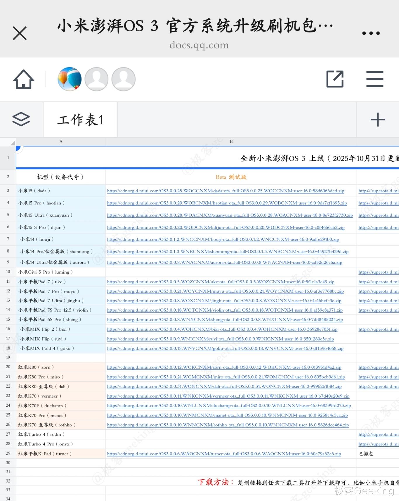 如何获取全新小米澎湃OS 3 的官方系统升级刷机包下载?就像初代和澎湃OS 2,这次极客君依然做了一个在线文档,持续更新小米澎湃OS 3 的系统包下载链接,包括 Beta 版和正式版,关注我并私信发送口令 “澎湃OS3” 即可获取。
