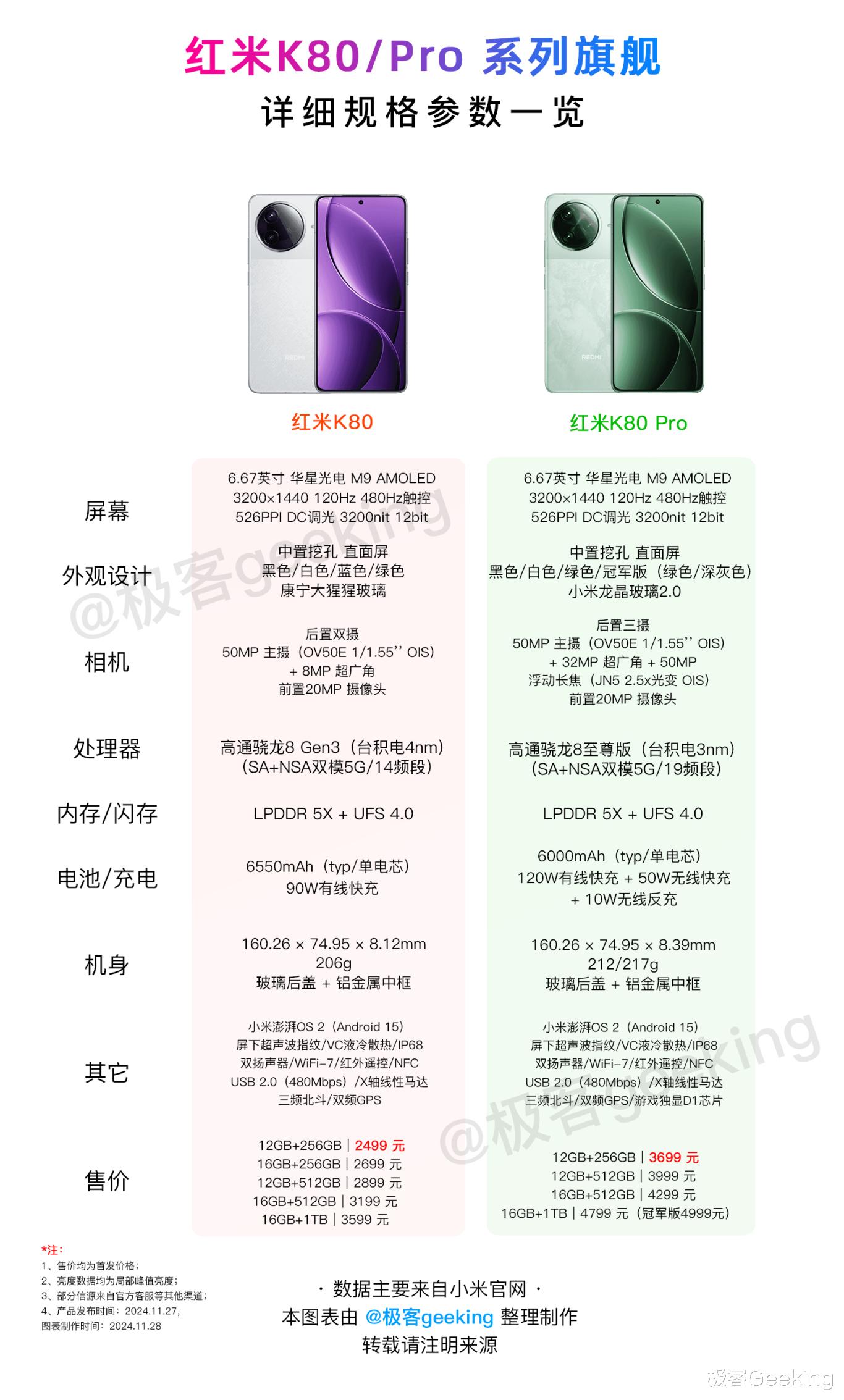 红米K80 这款产品上市于 2024 年底,回顾 K80/Pro 系列两款旗舰手机的详细配置参数一图总结对比如下: