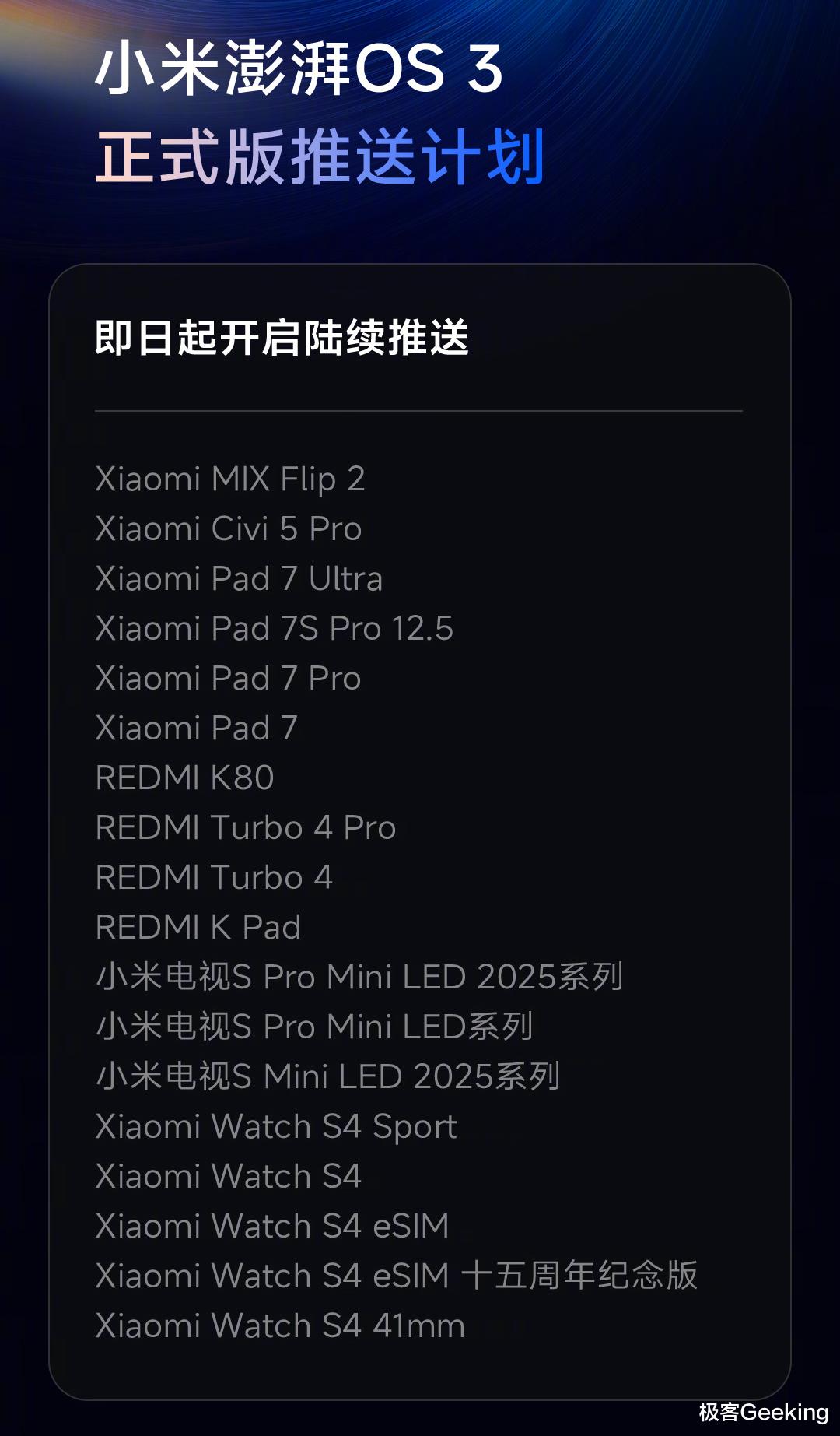 包括第一批和第二批在内,根据小米官方公布的澎湃OS 3 正式版的升级计划和适配机型名单,其升级计划共分为 6 批,最晚一批将在明年 1 月发布,这里做个完整推送计划整理,可以对号入座一下,看看自己的手机什么时候获推澎湃OS 3 正式版升级。