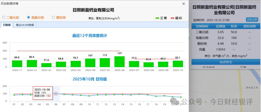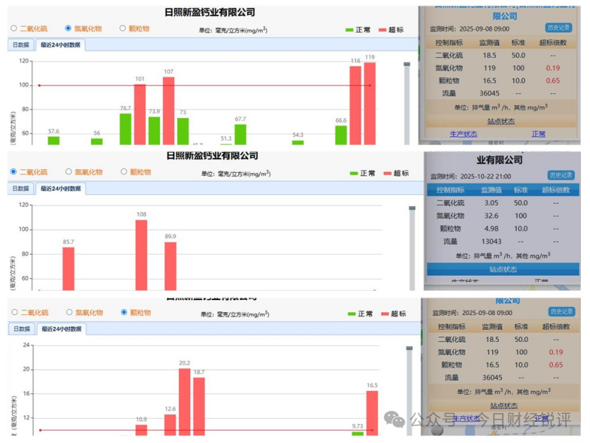 日照新盈钙业有限公司:二氧化硫、氮氧化物、颗粒物的小时值与日均值双双超标,污染排放“全面开花”。